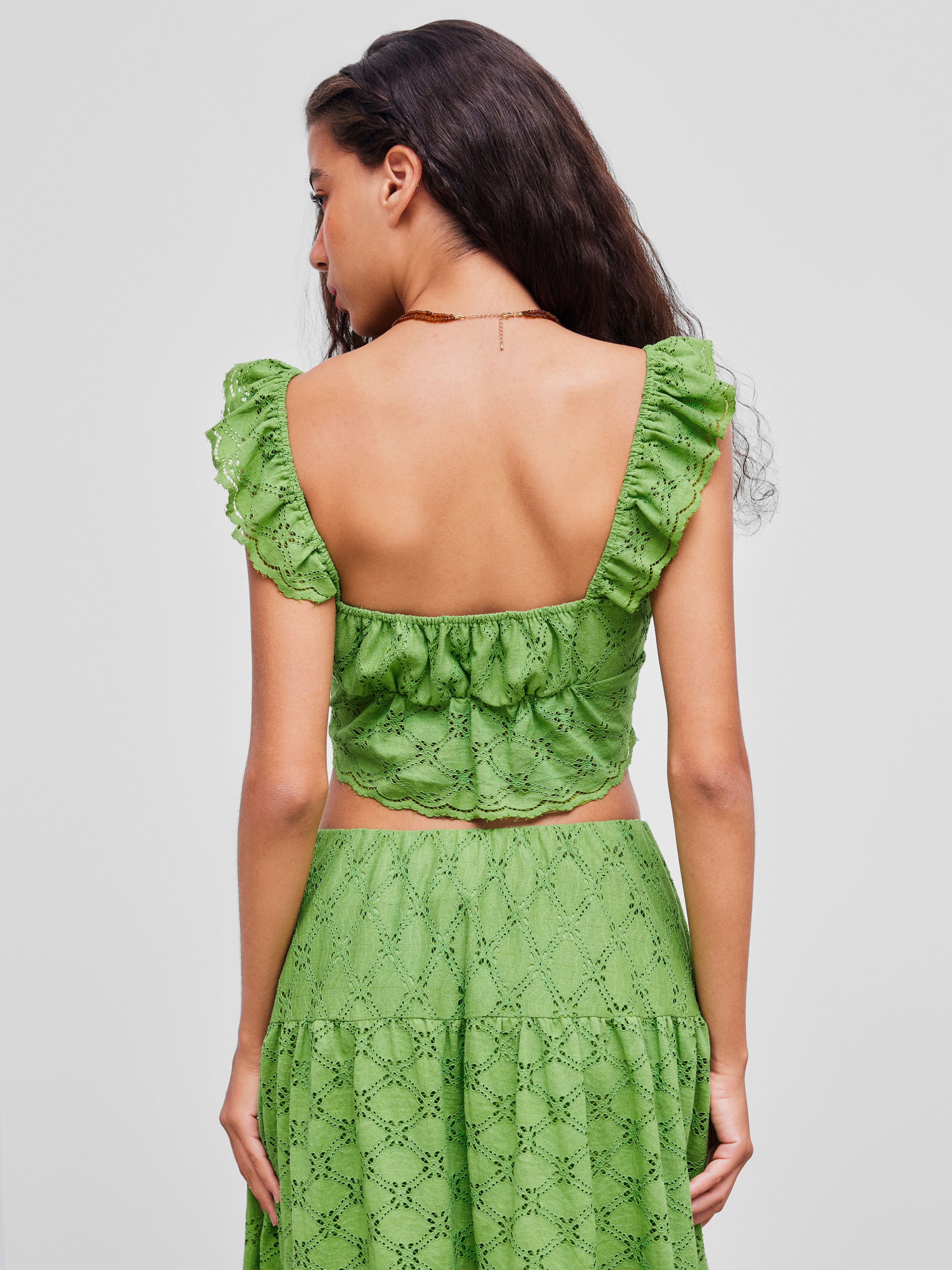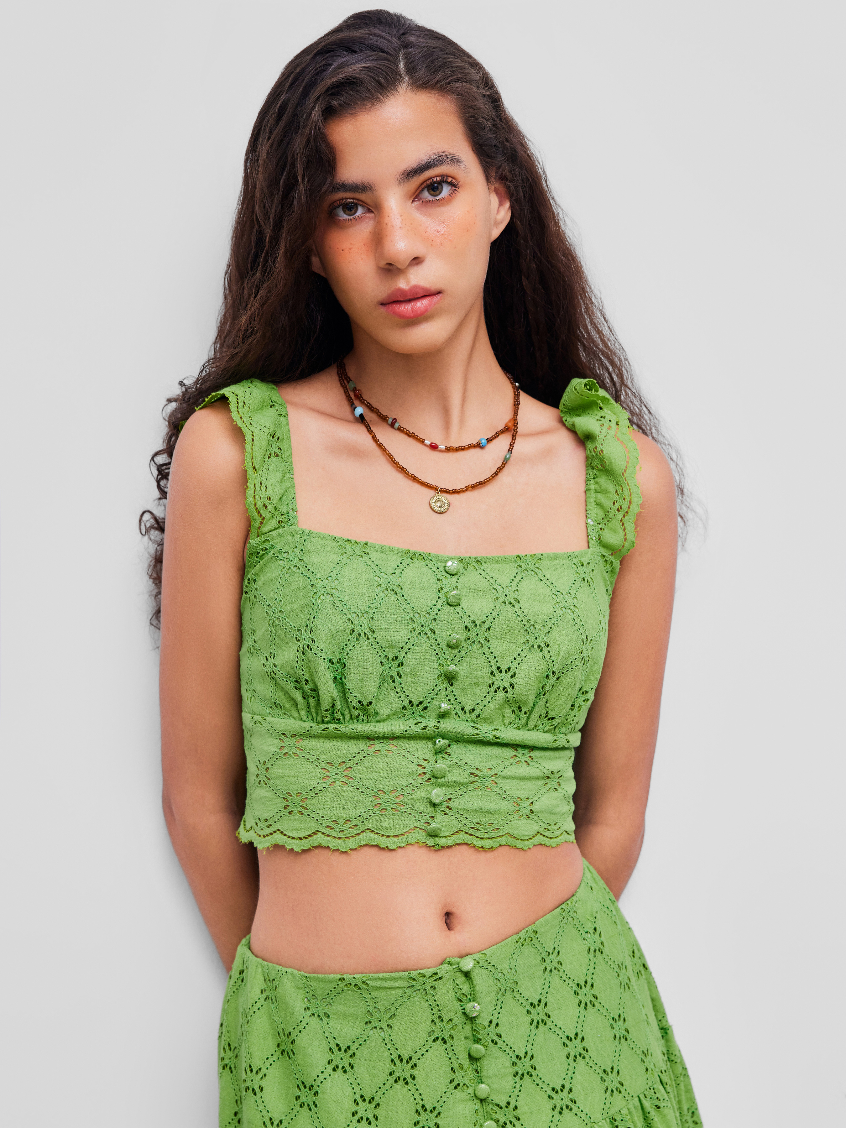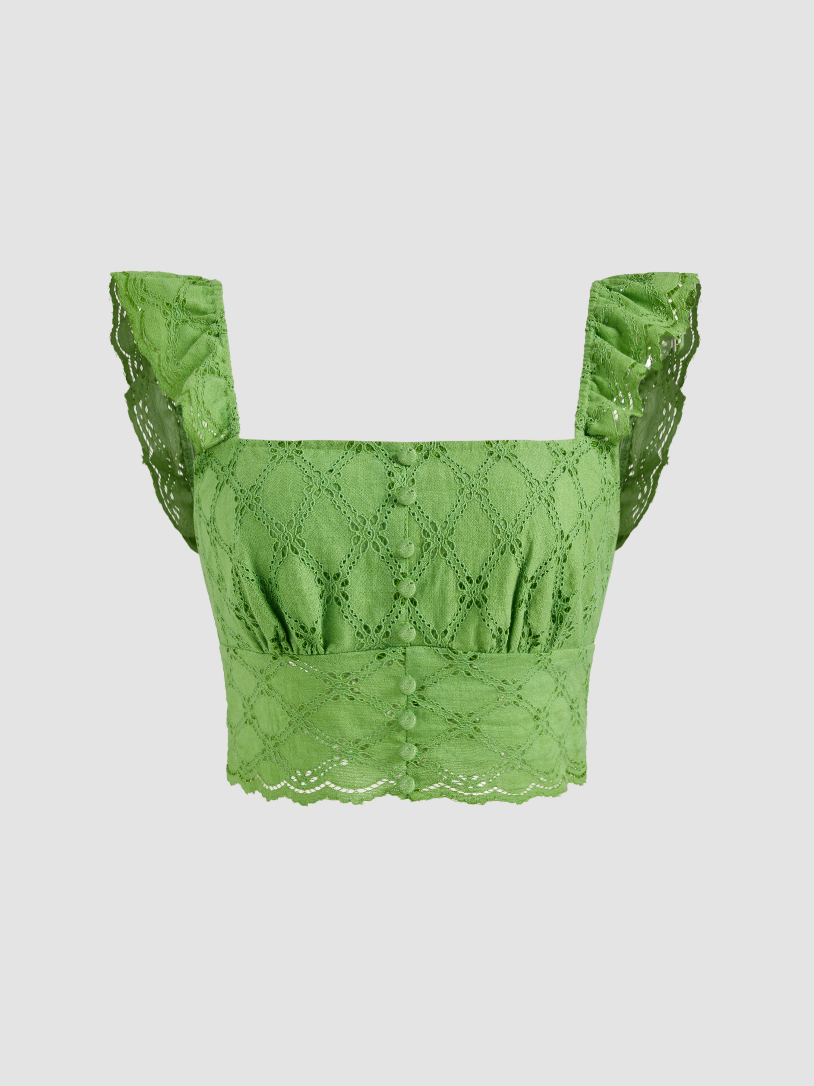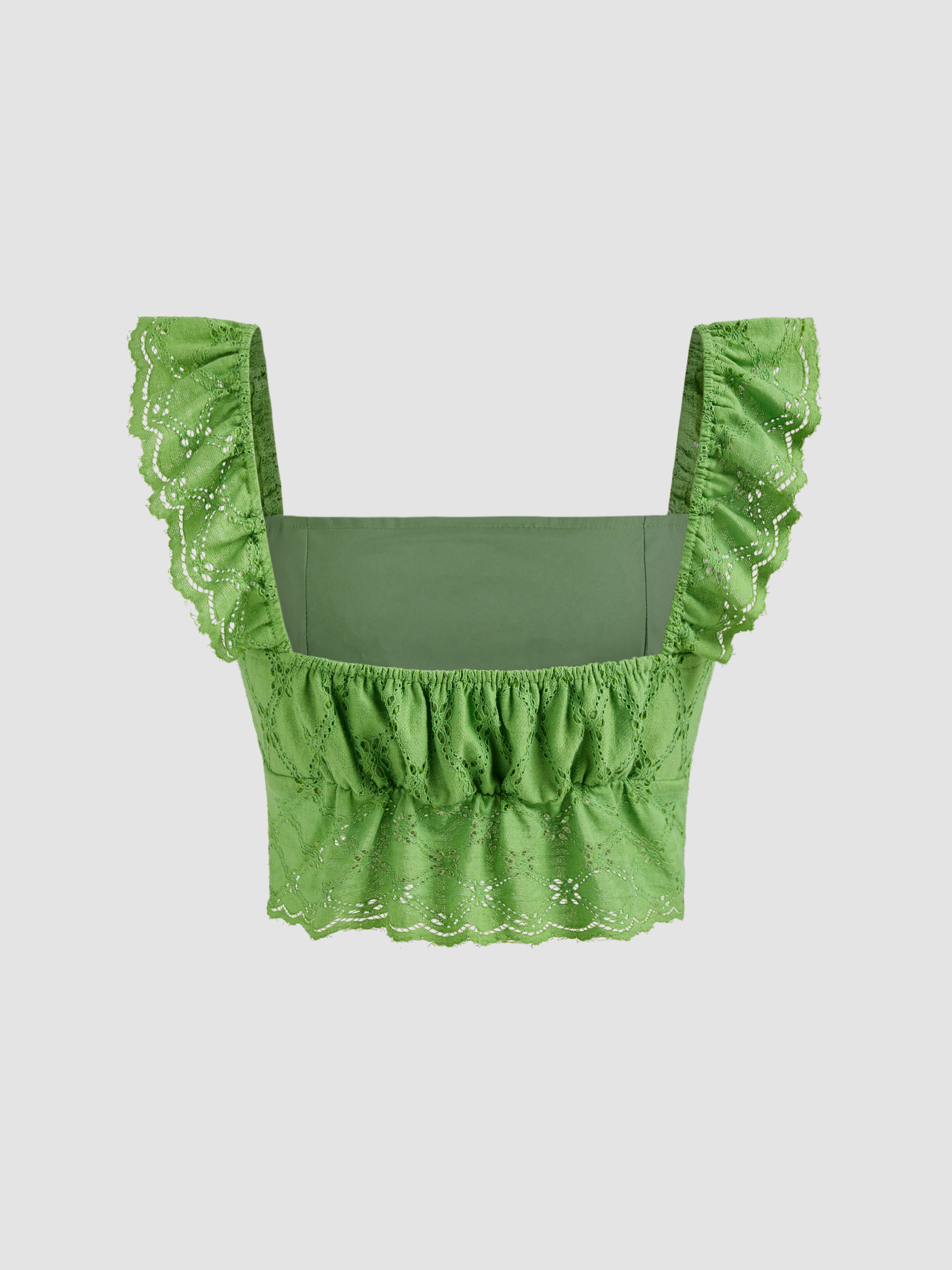 Broderie-Anglaise-Baumwollmischung Quadratischer Ausschnitt Einfarbiges Crop Tank Top