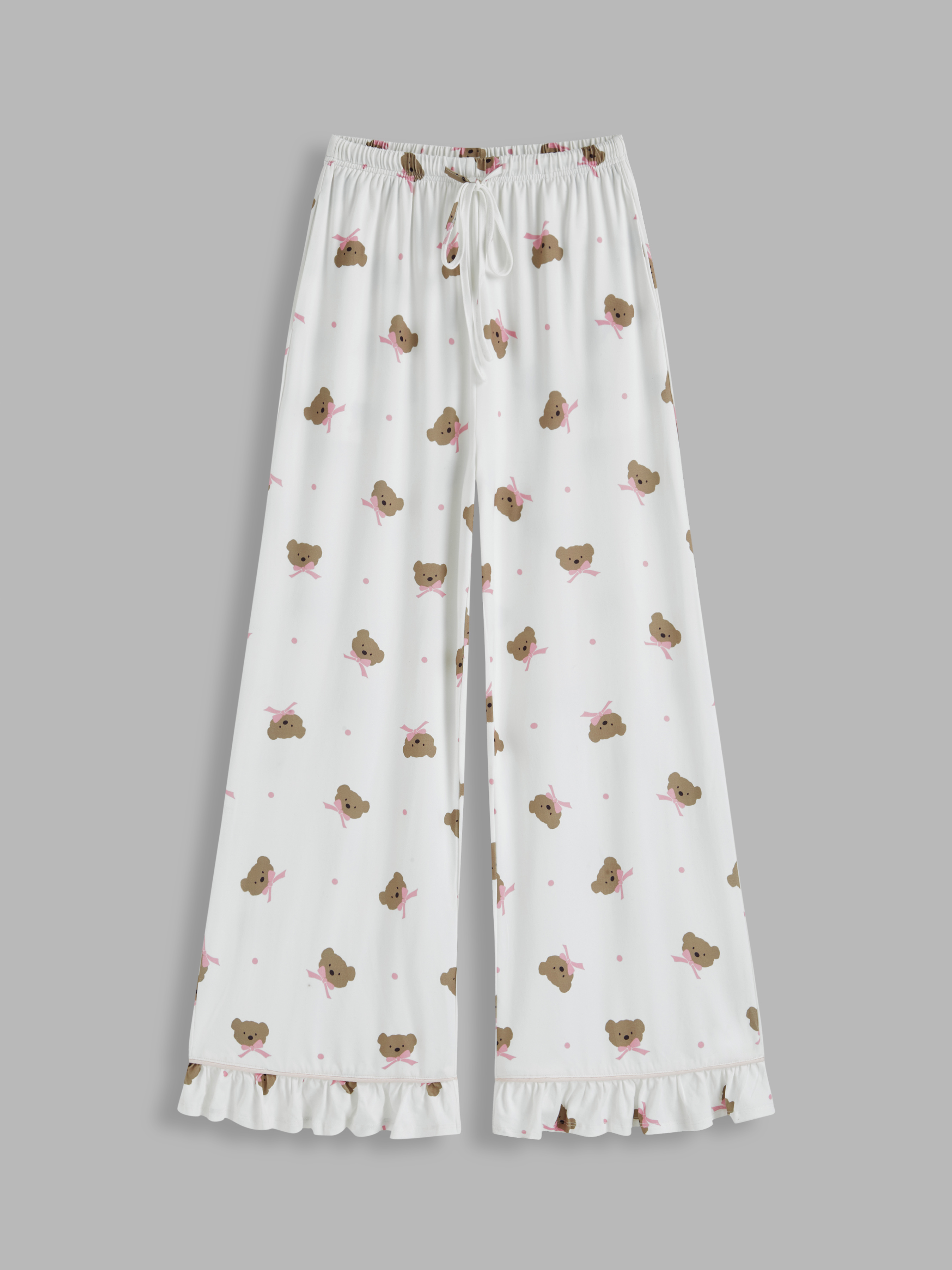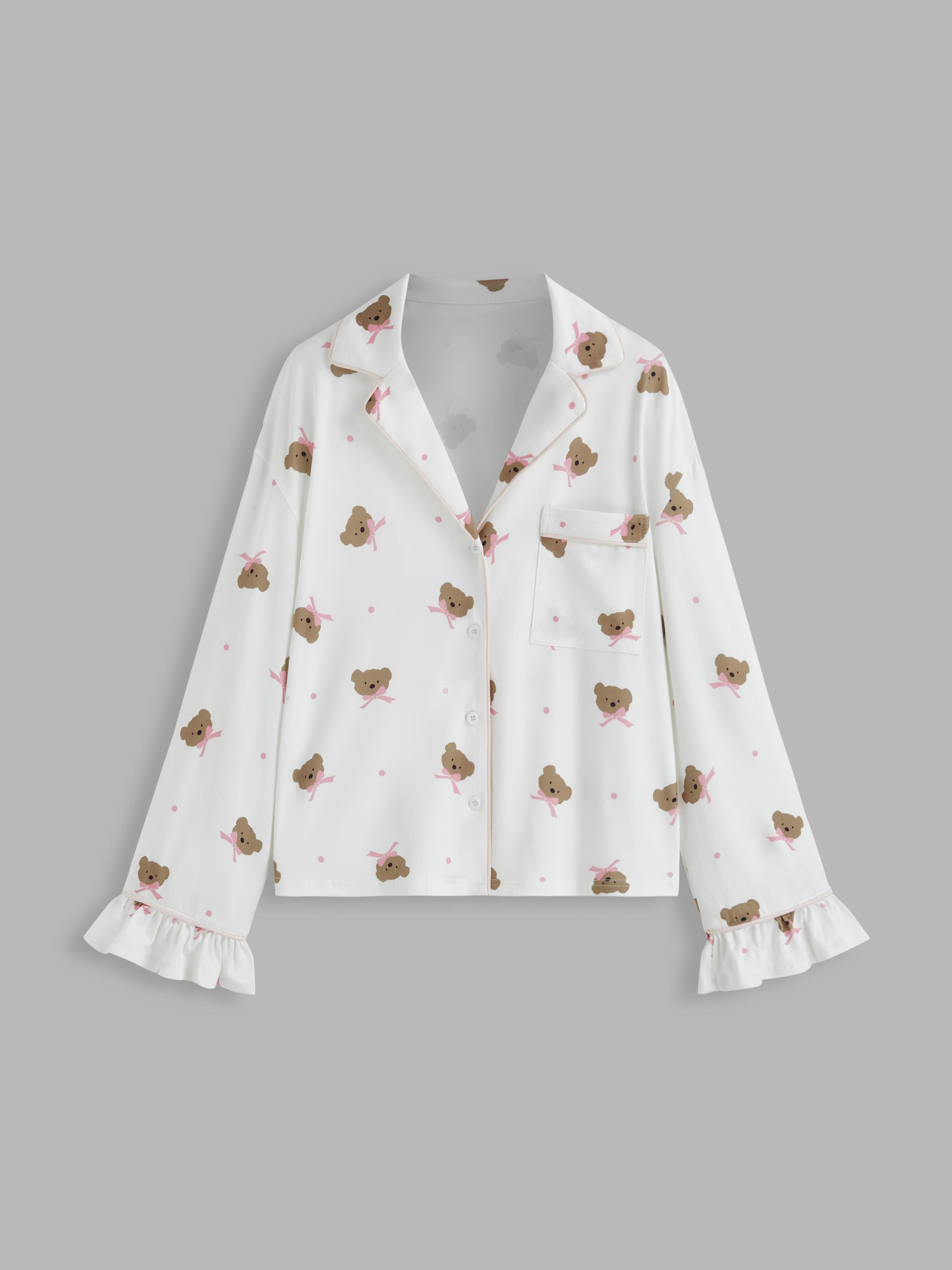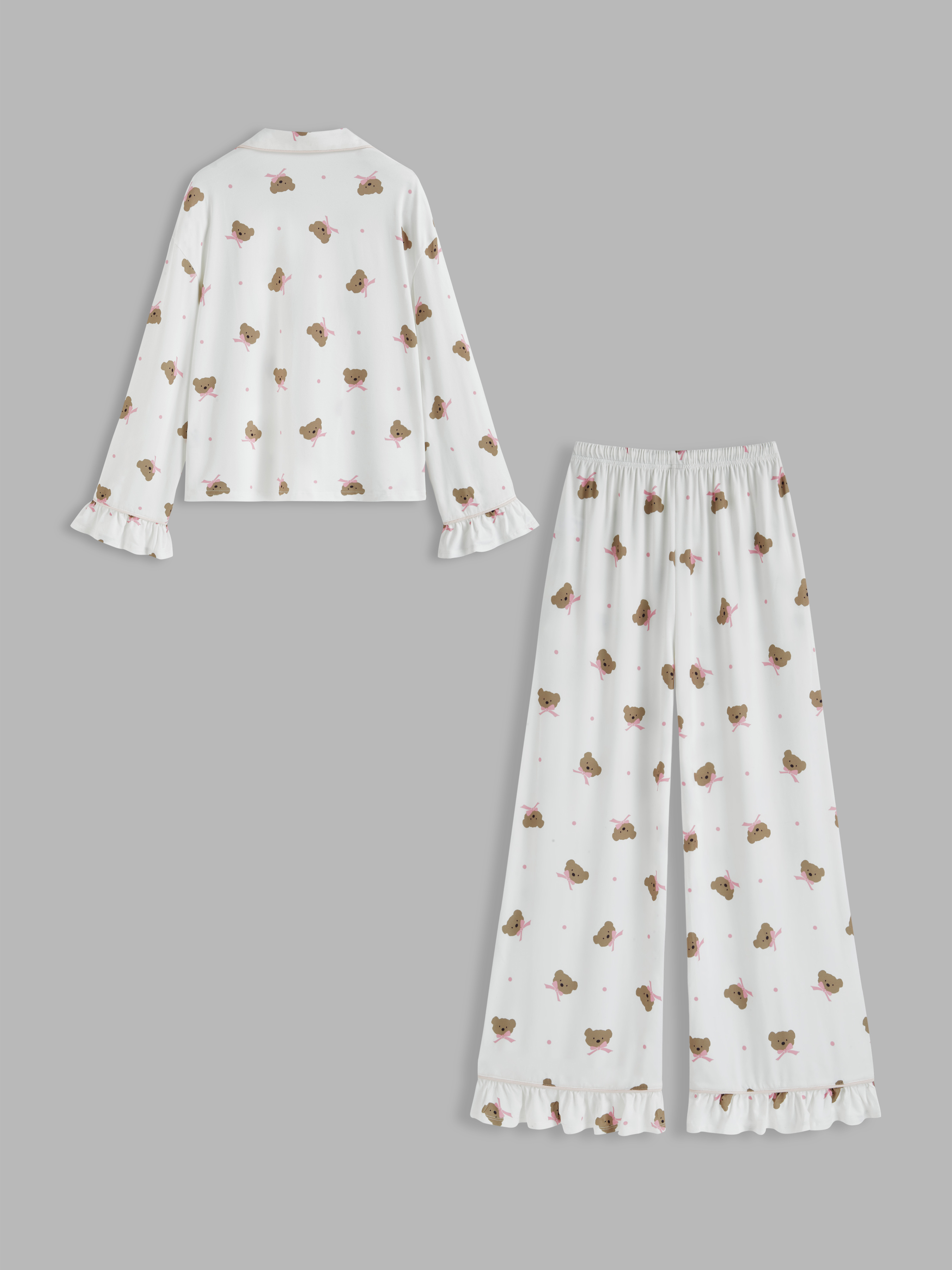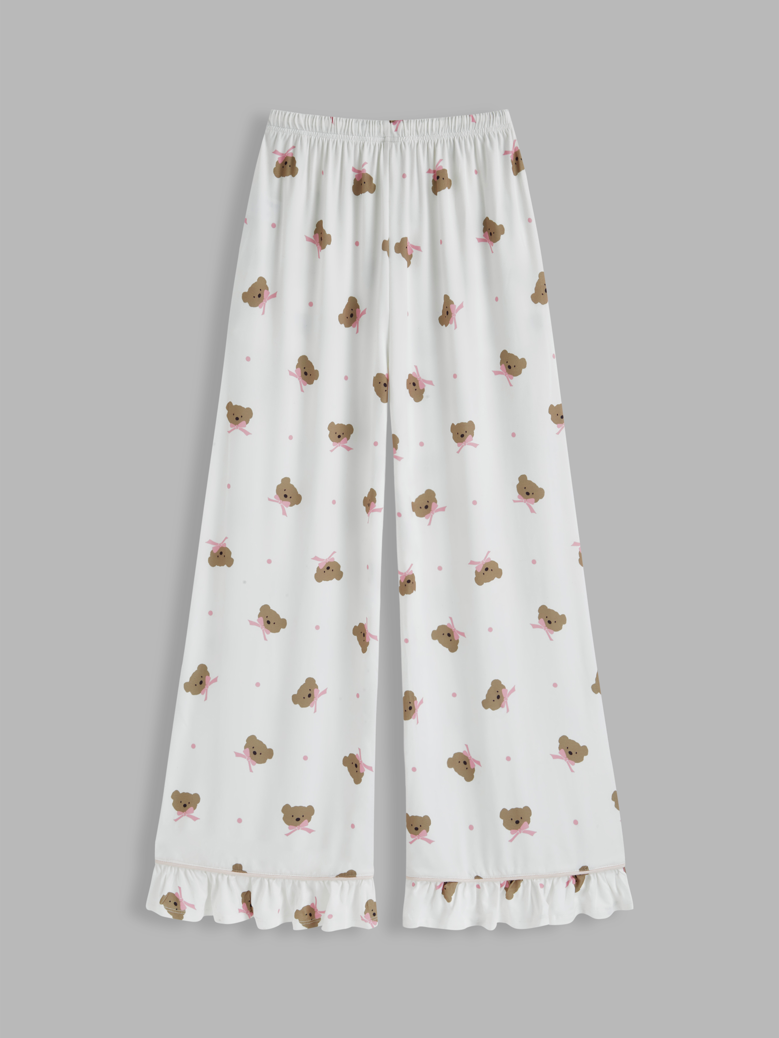 Loungewear-Set mit Kragenbogen-Bären-Grafik-Oberteil und Mittelbundhosen
