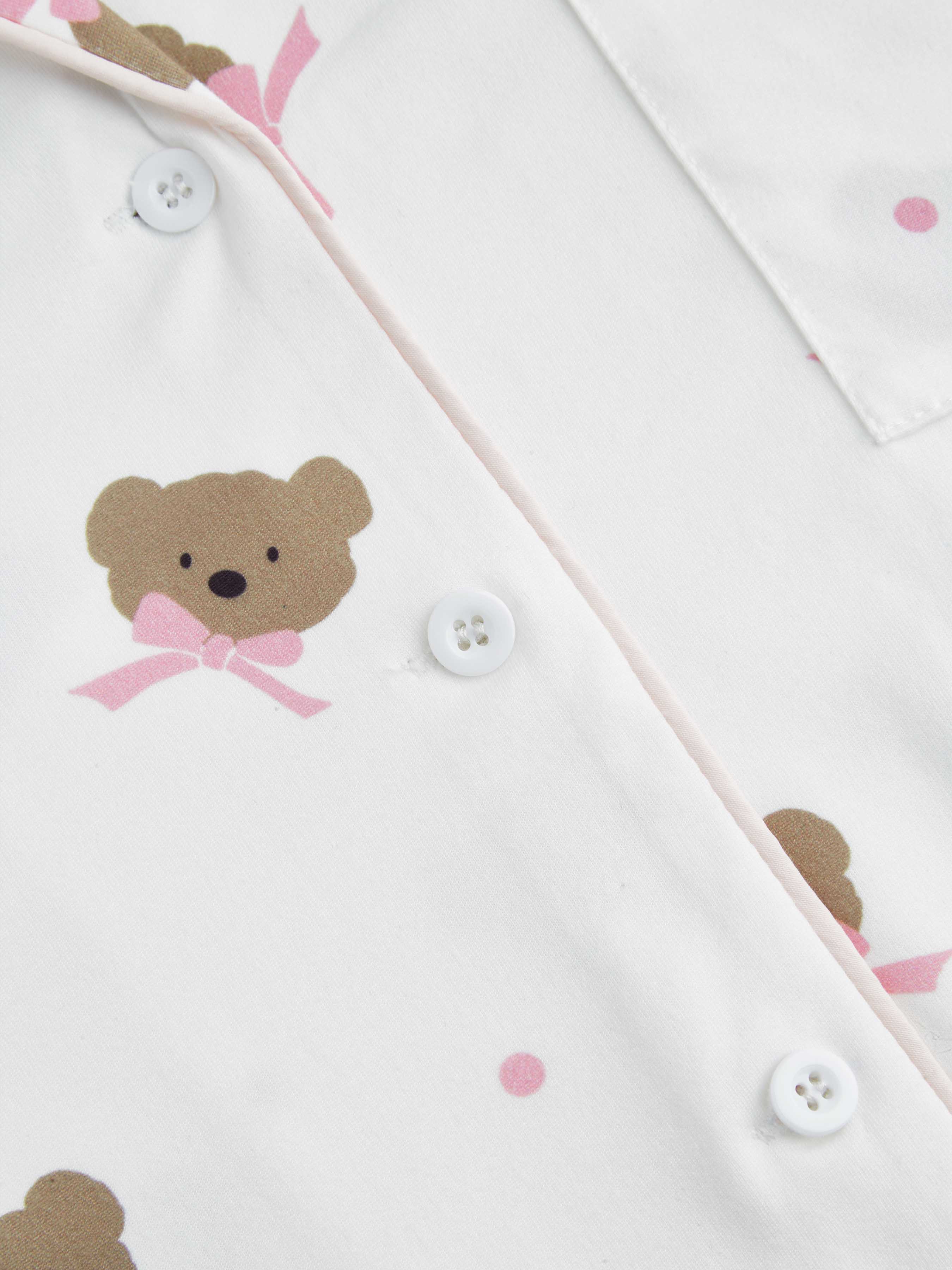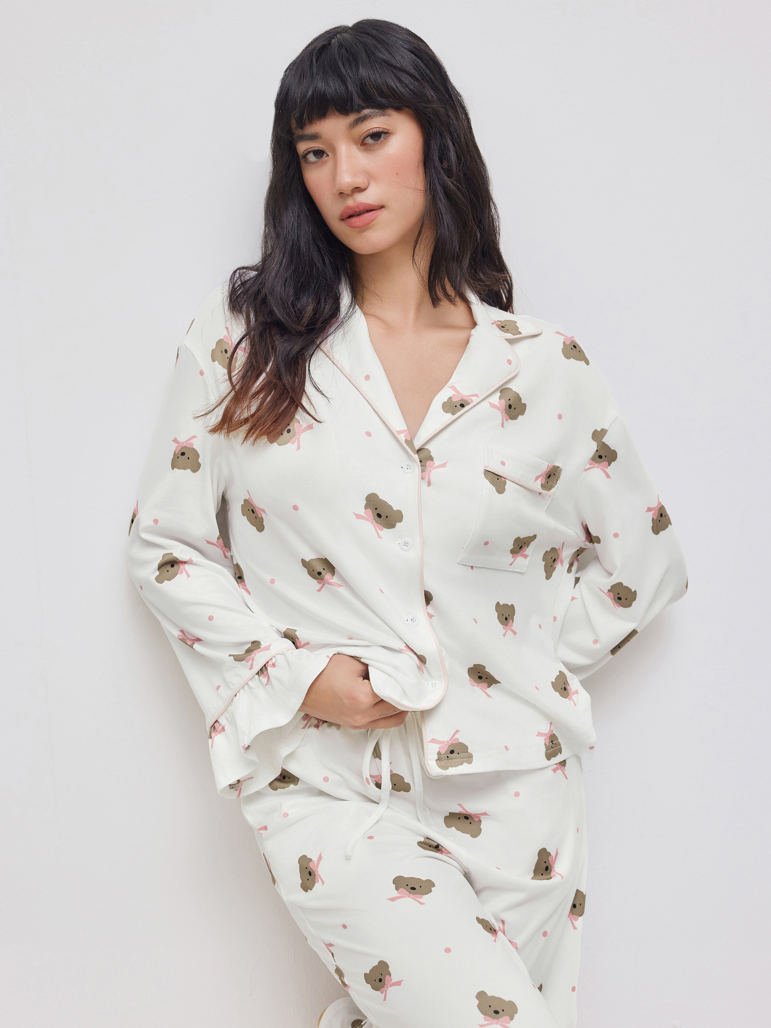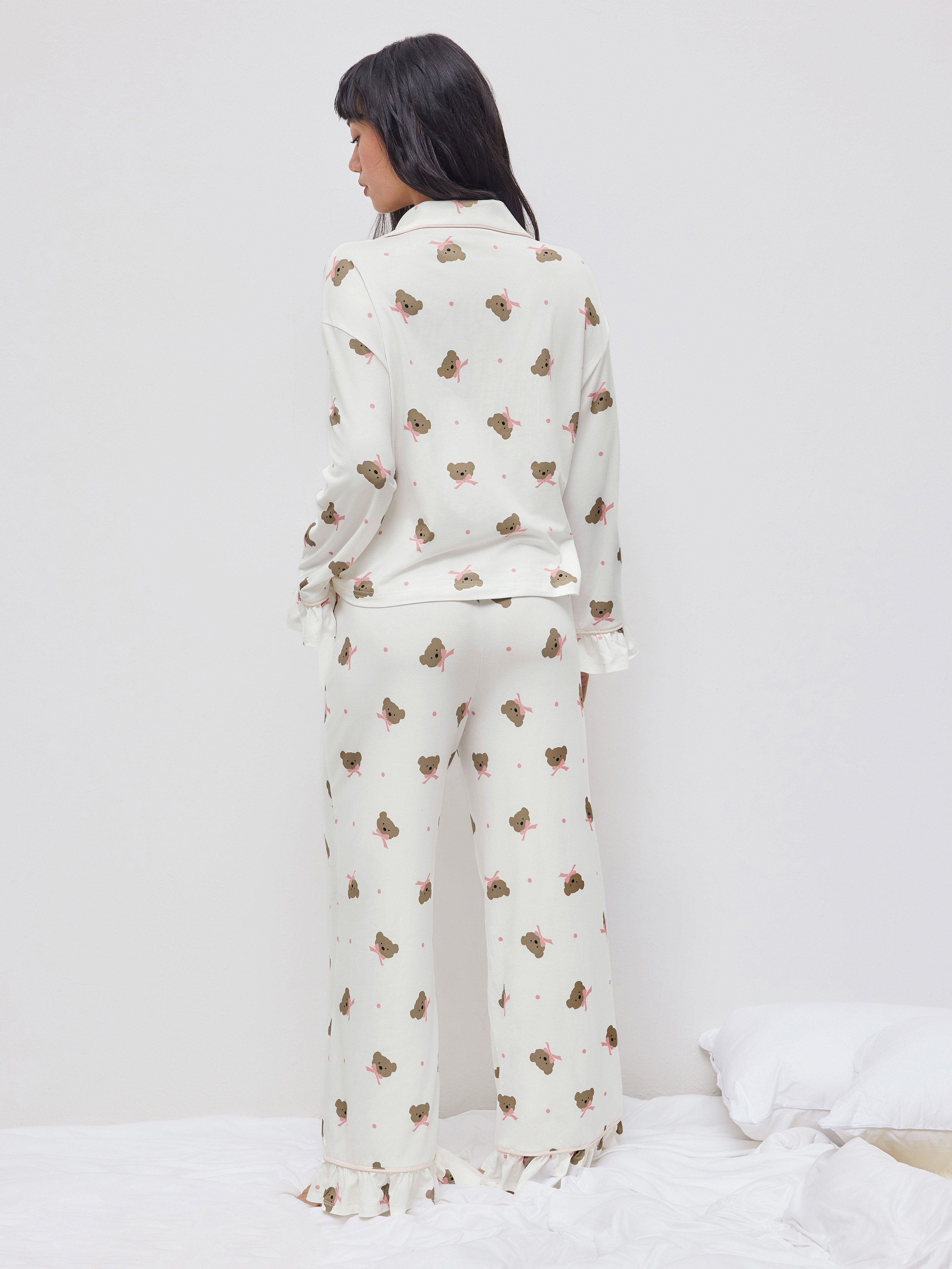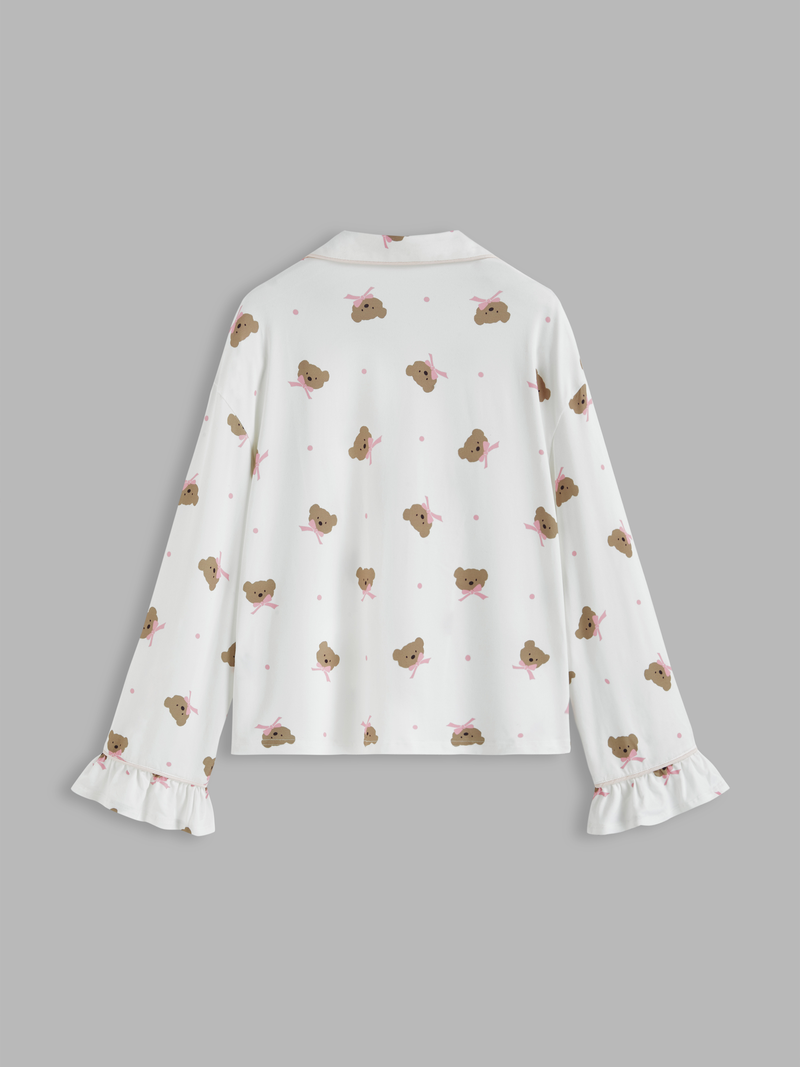 Loungewear-Set mit Kragenbogen-Bären-Grafik-Oberteil und Mittelbundhosen