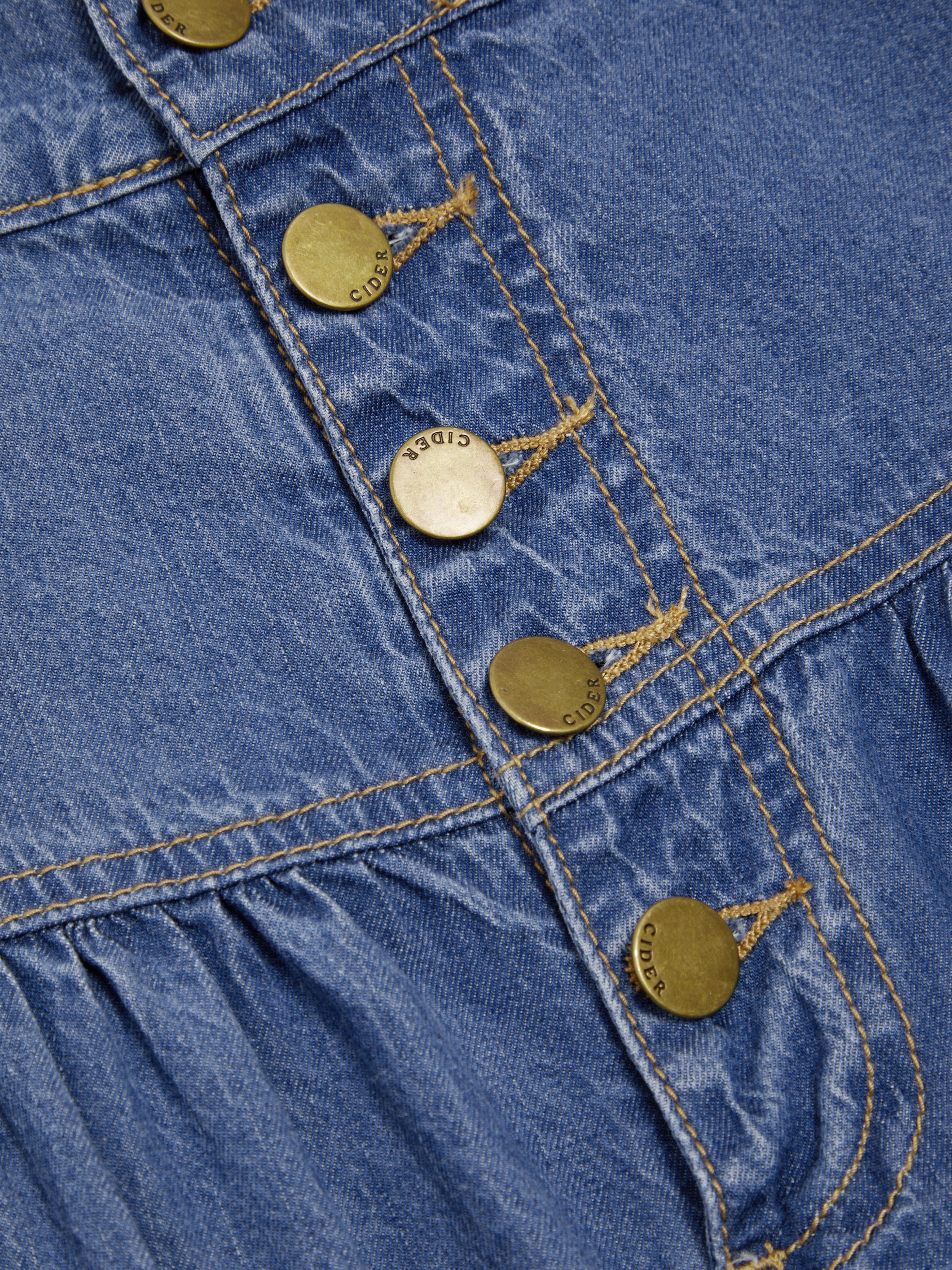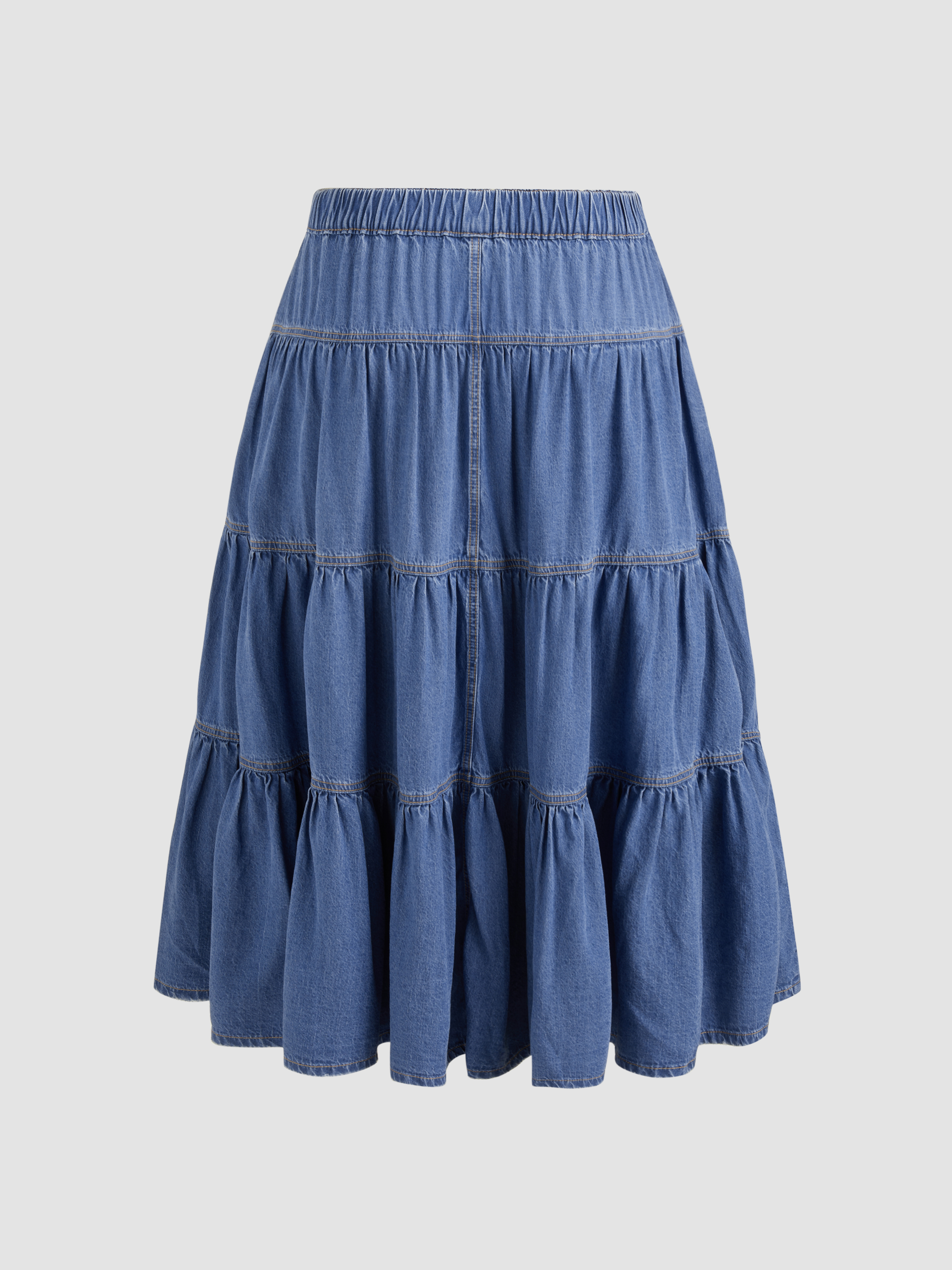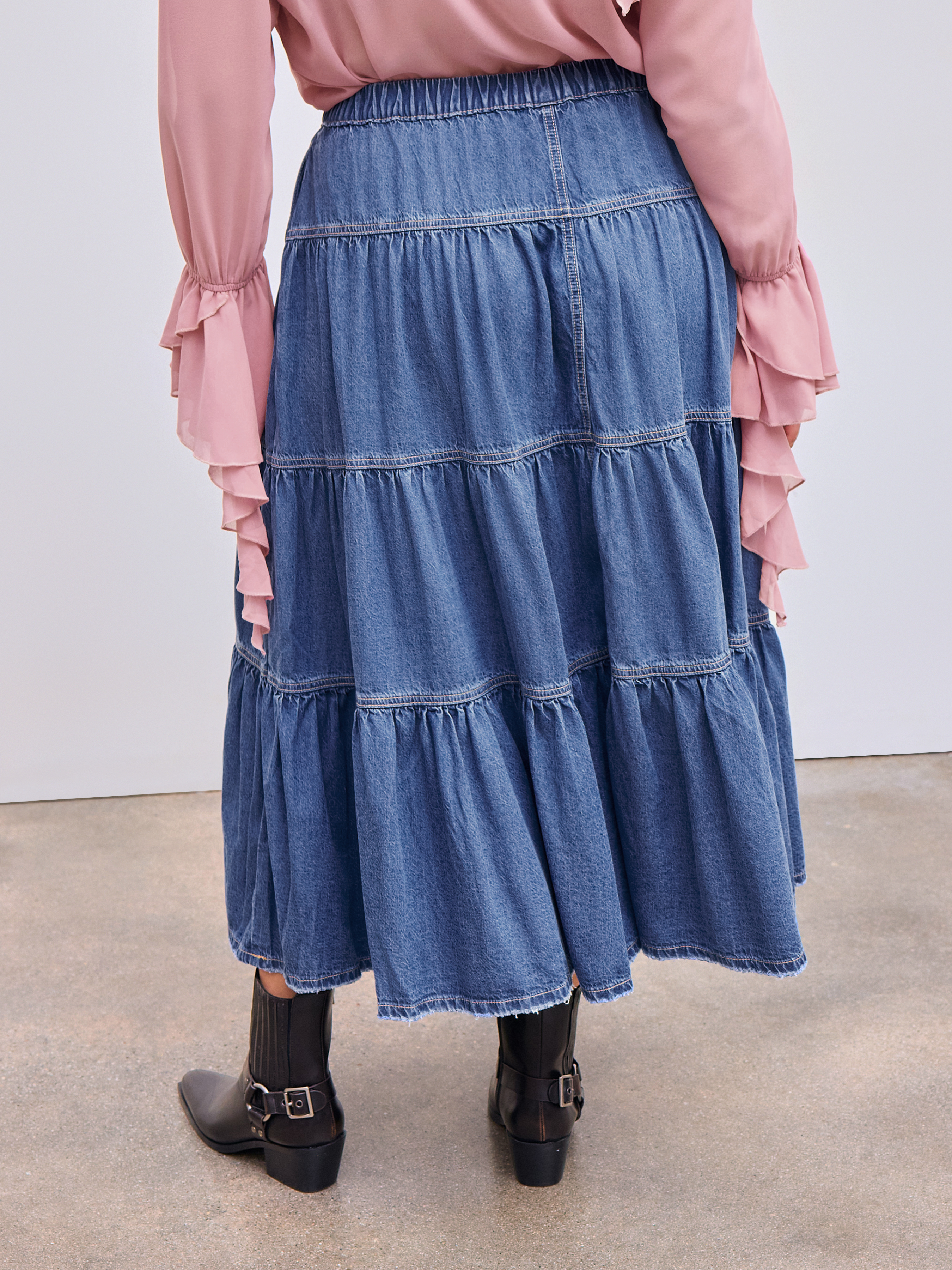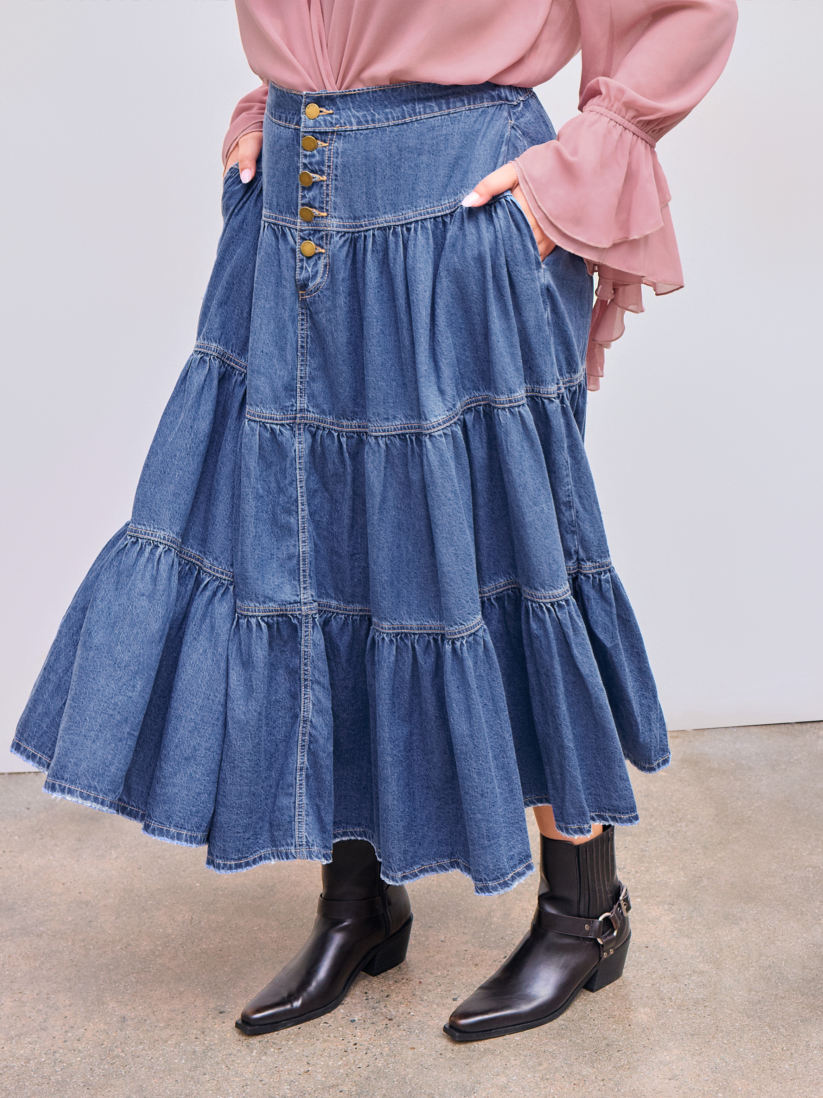 Jeans Maxi-Gonne mit mittlerem Bund, einfarbig, geschichtet, Knöpfen und Taschen Kurve & Plus