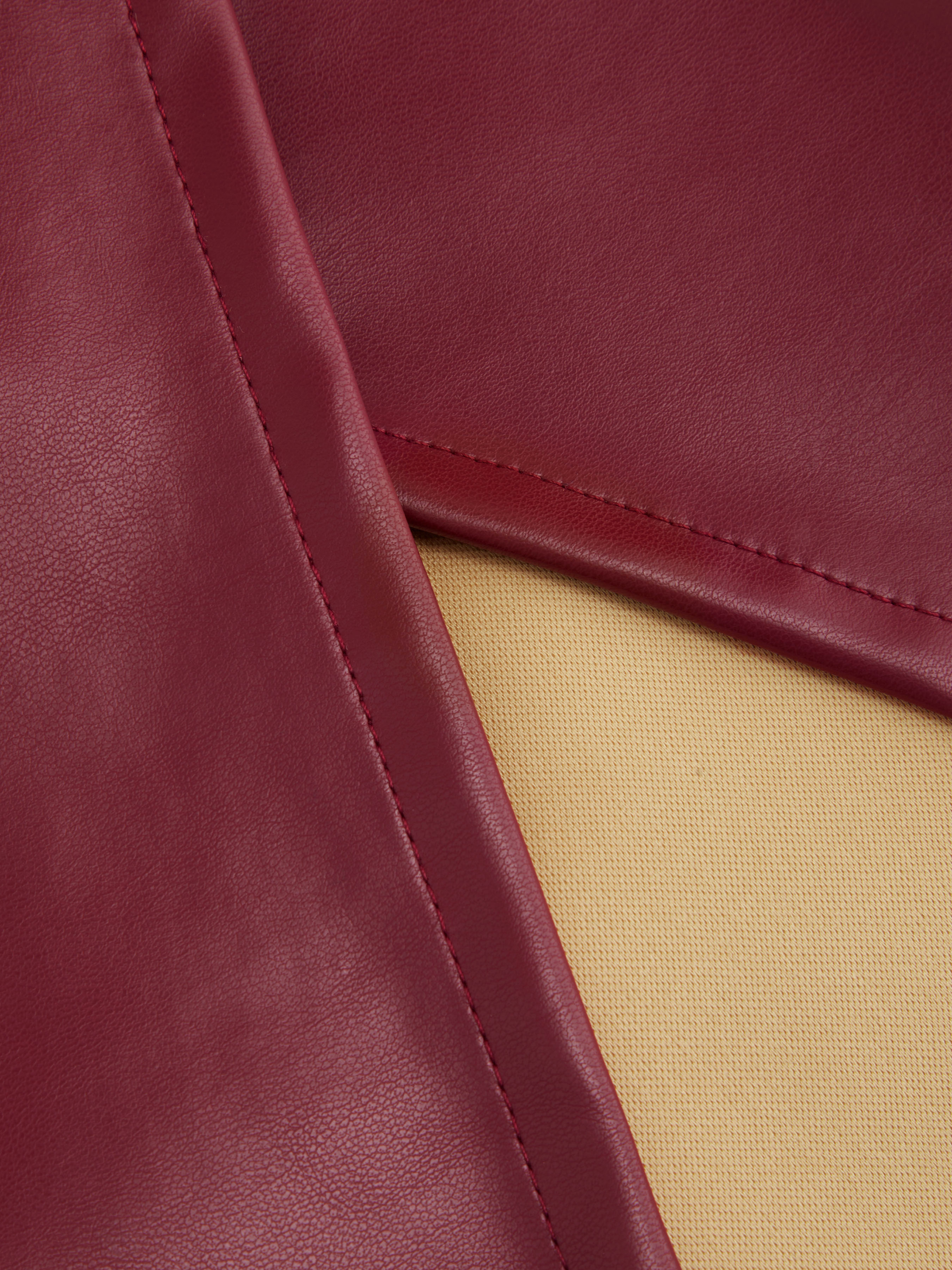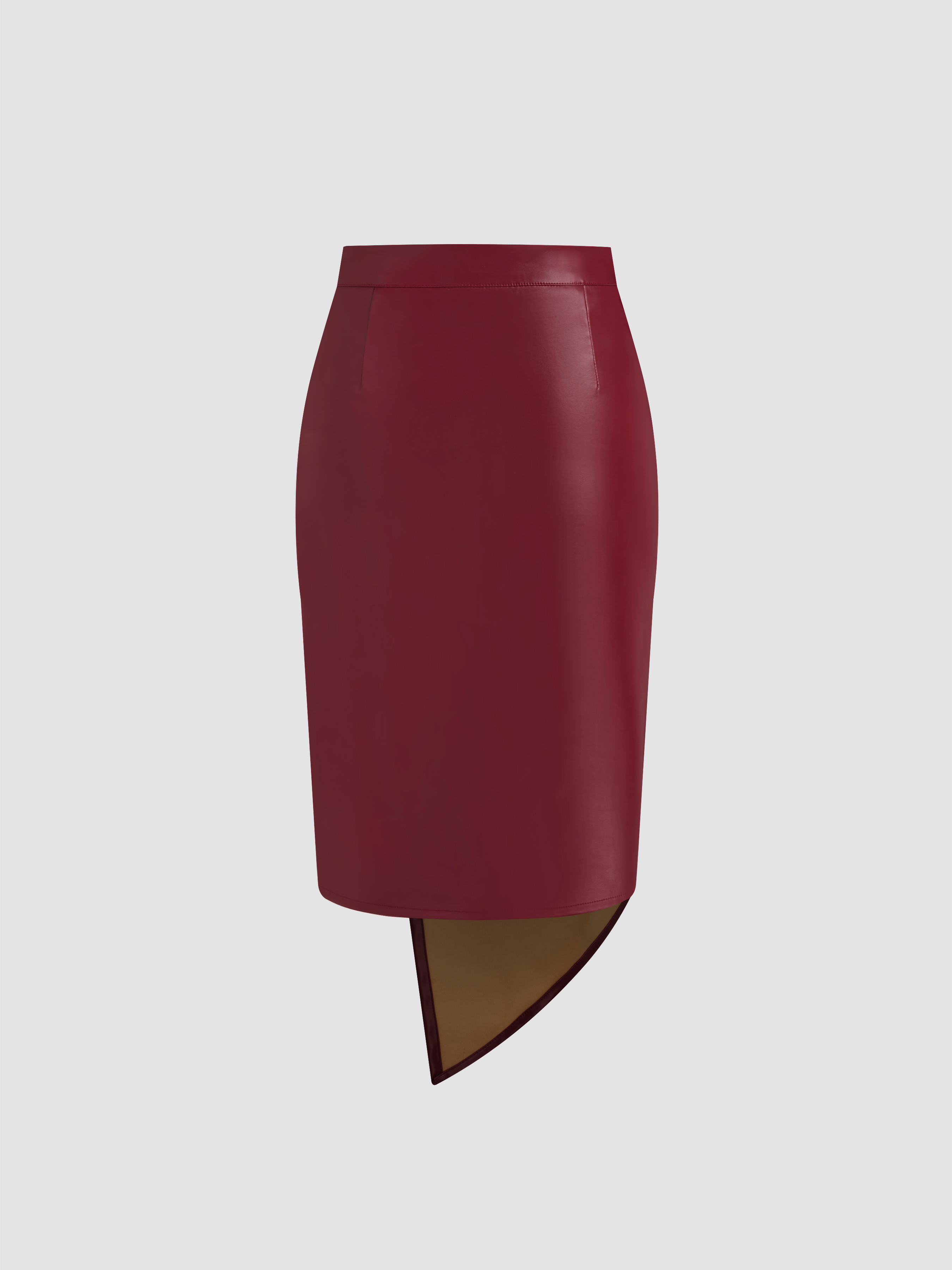 Faux-Leder-Midi-Skirt mit Mittlerem Bund, Einfarbig und Rüschen und Spalt