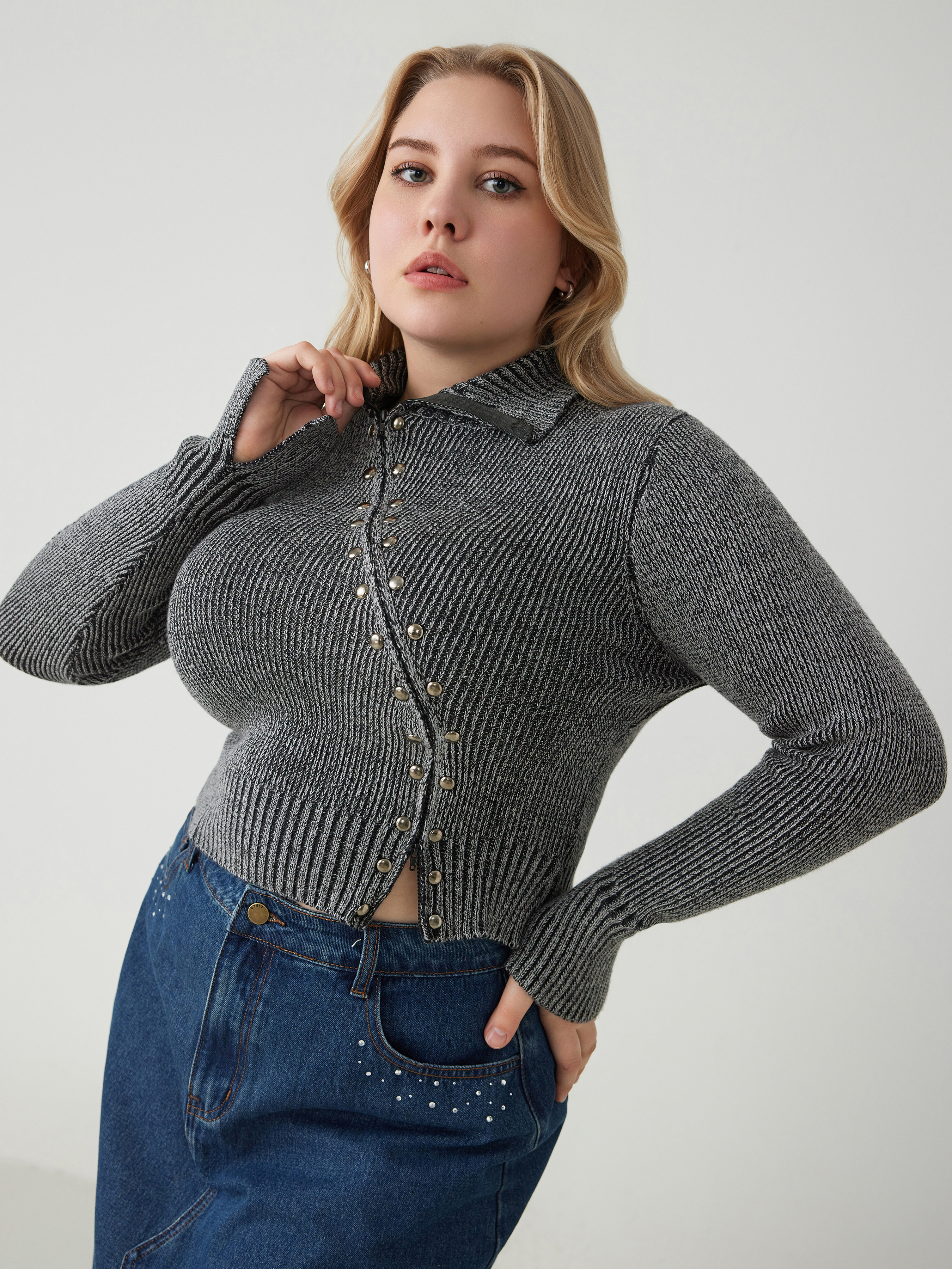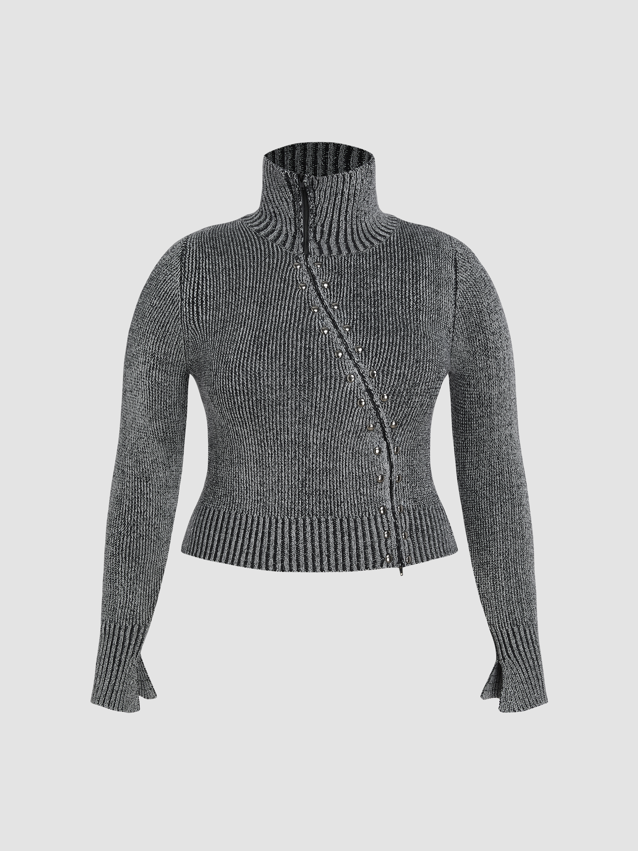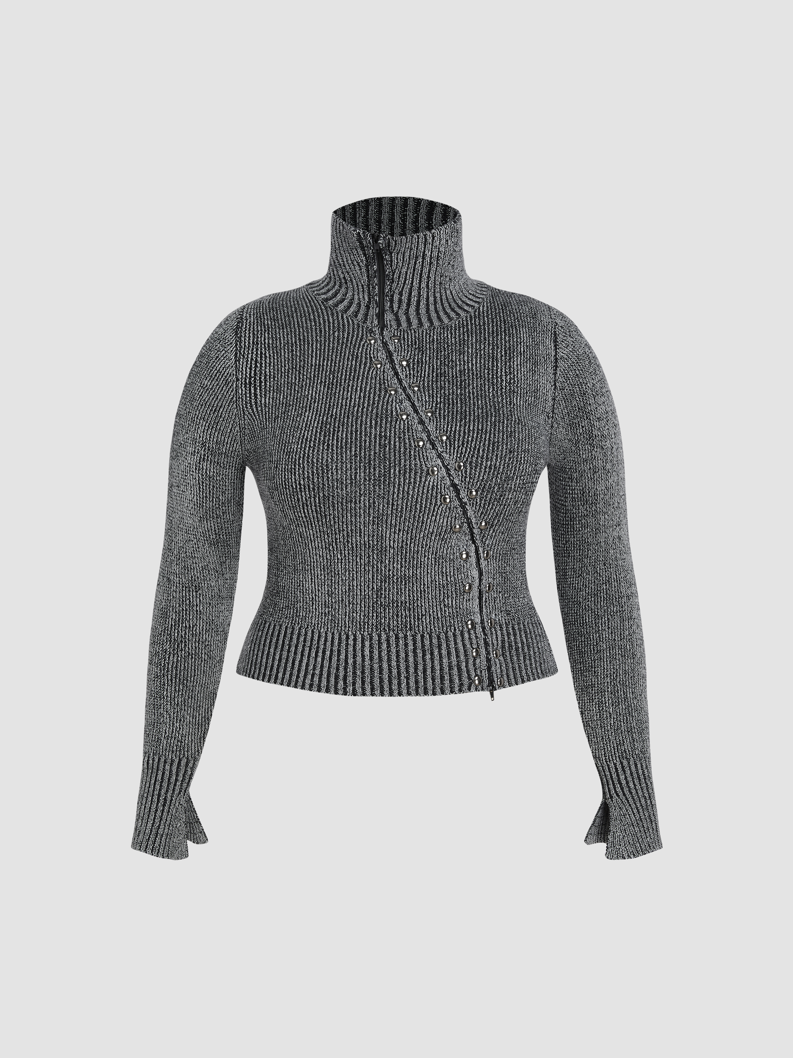 Hochhalsiger Niet-Reißverschluss Crop Strickjacke Kurve & Plus