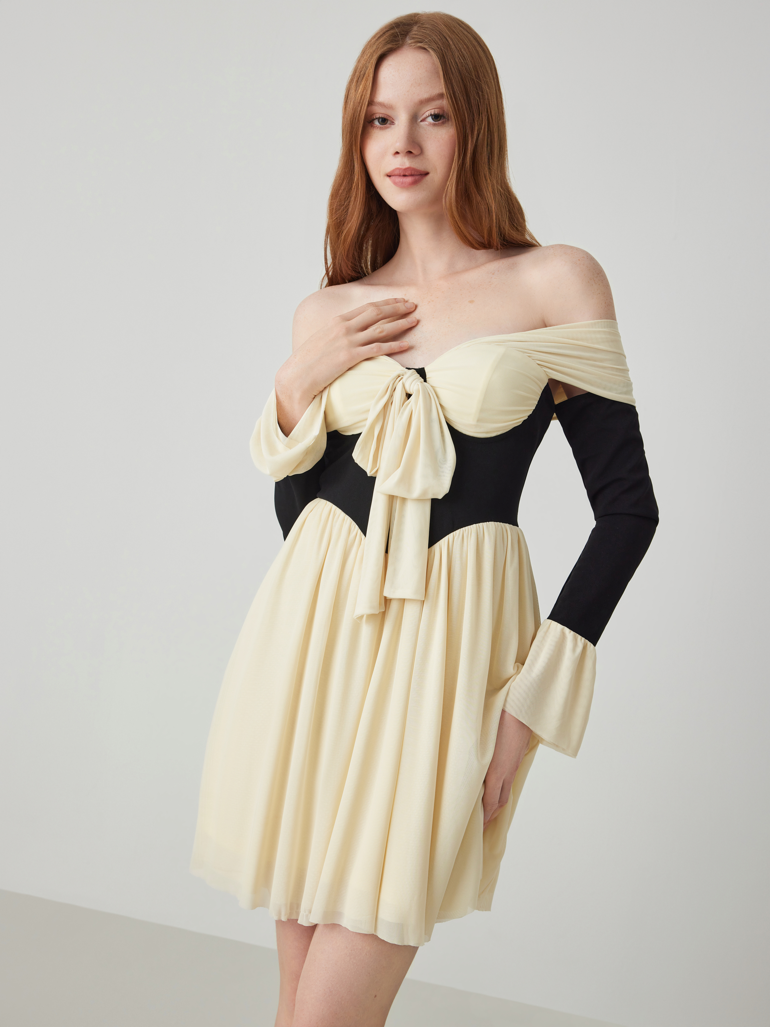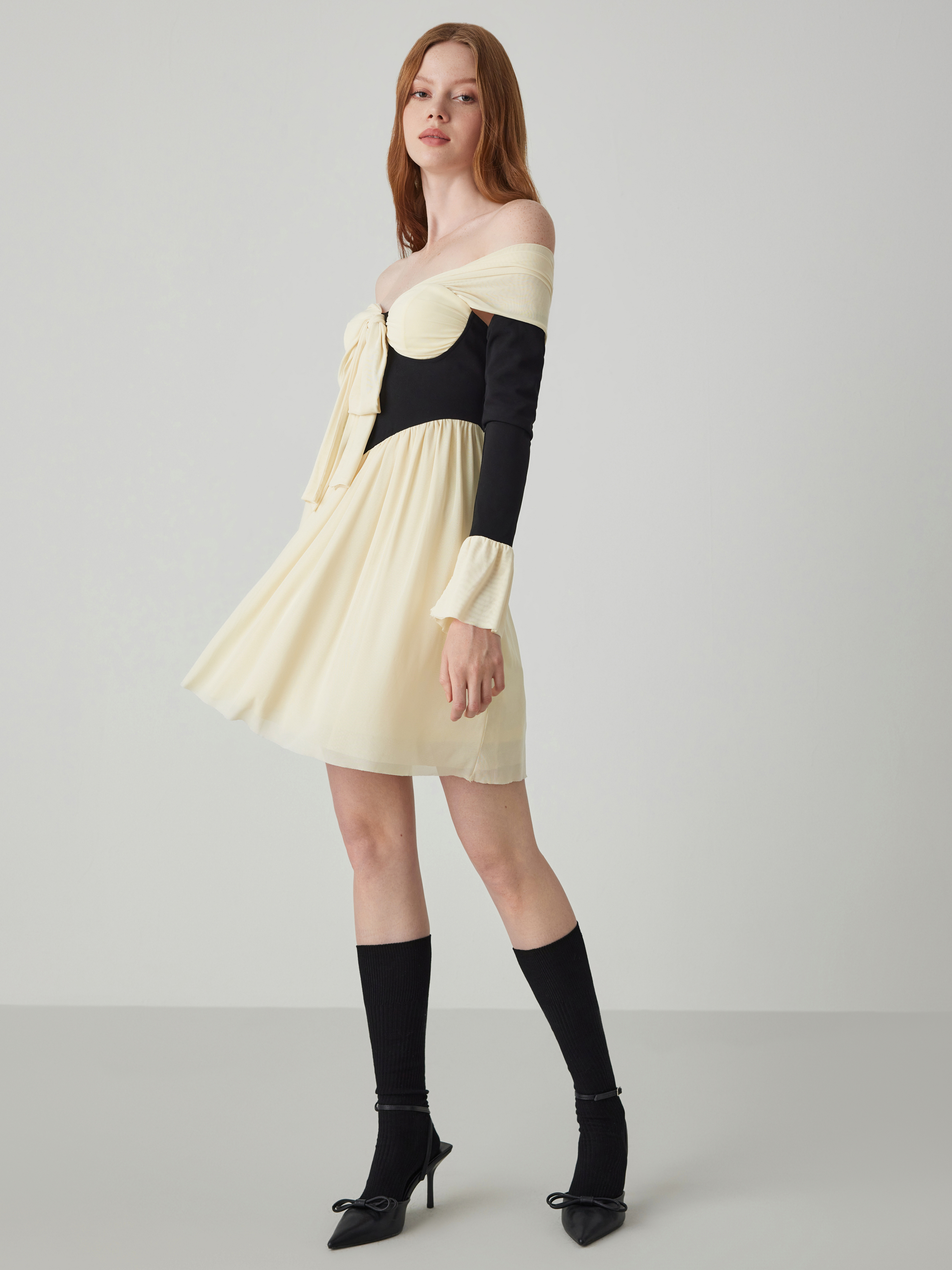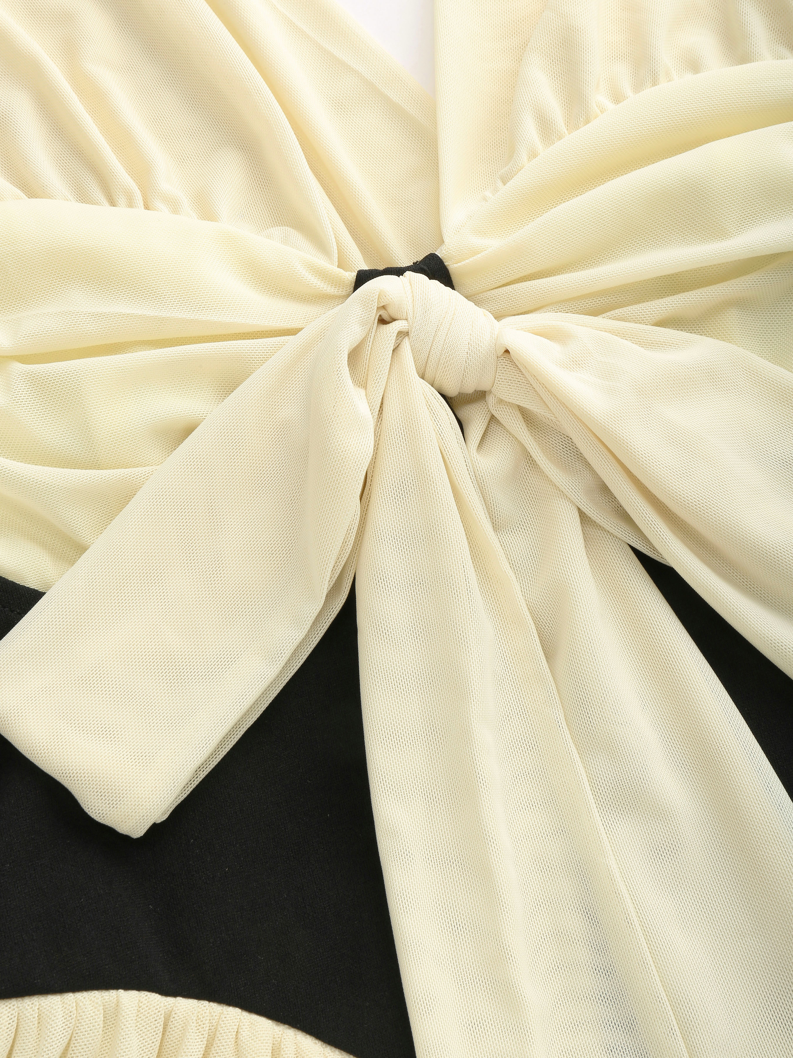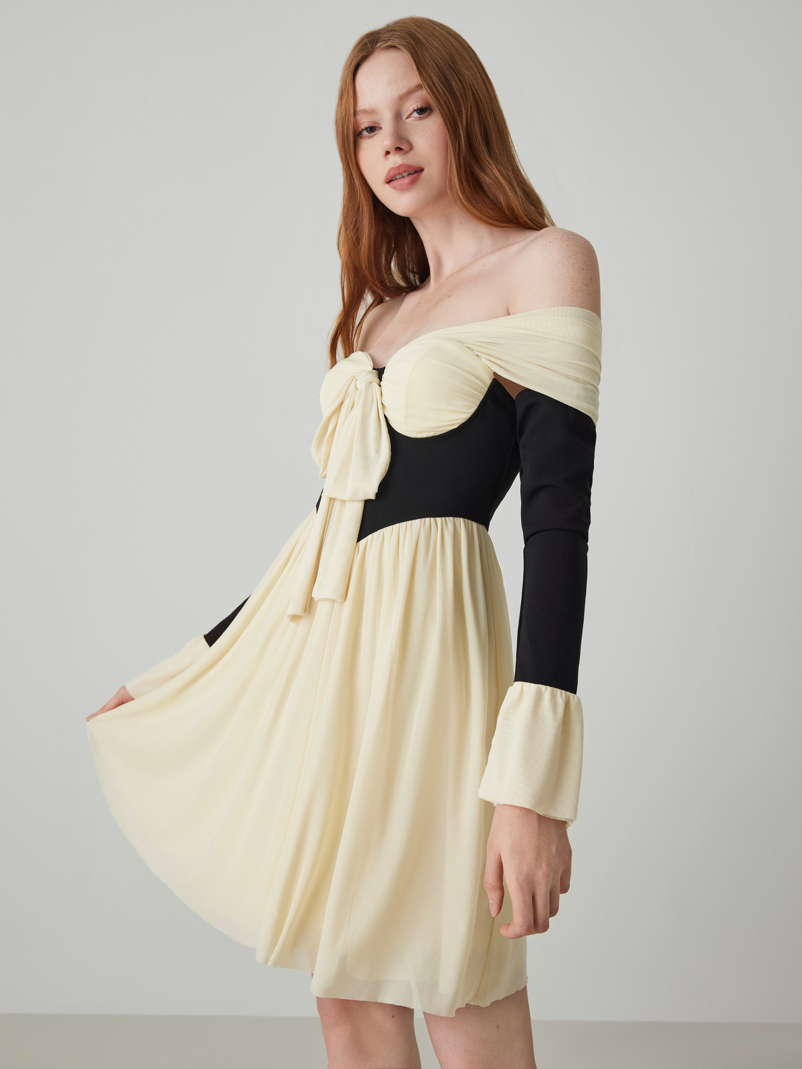 Gestricktes schulterfreies Korsett mit kontrastierender Schleife Minikleid