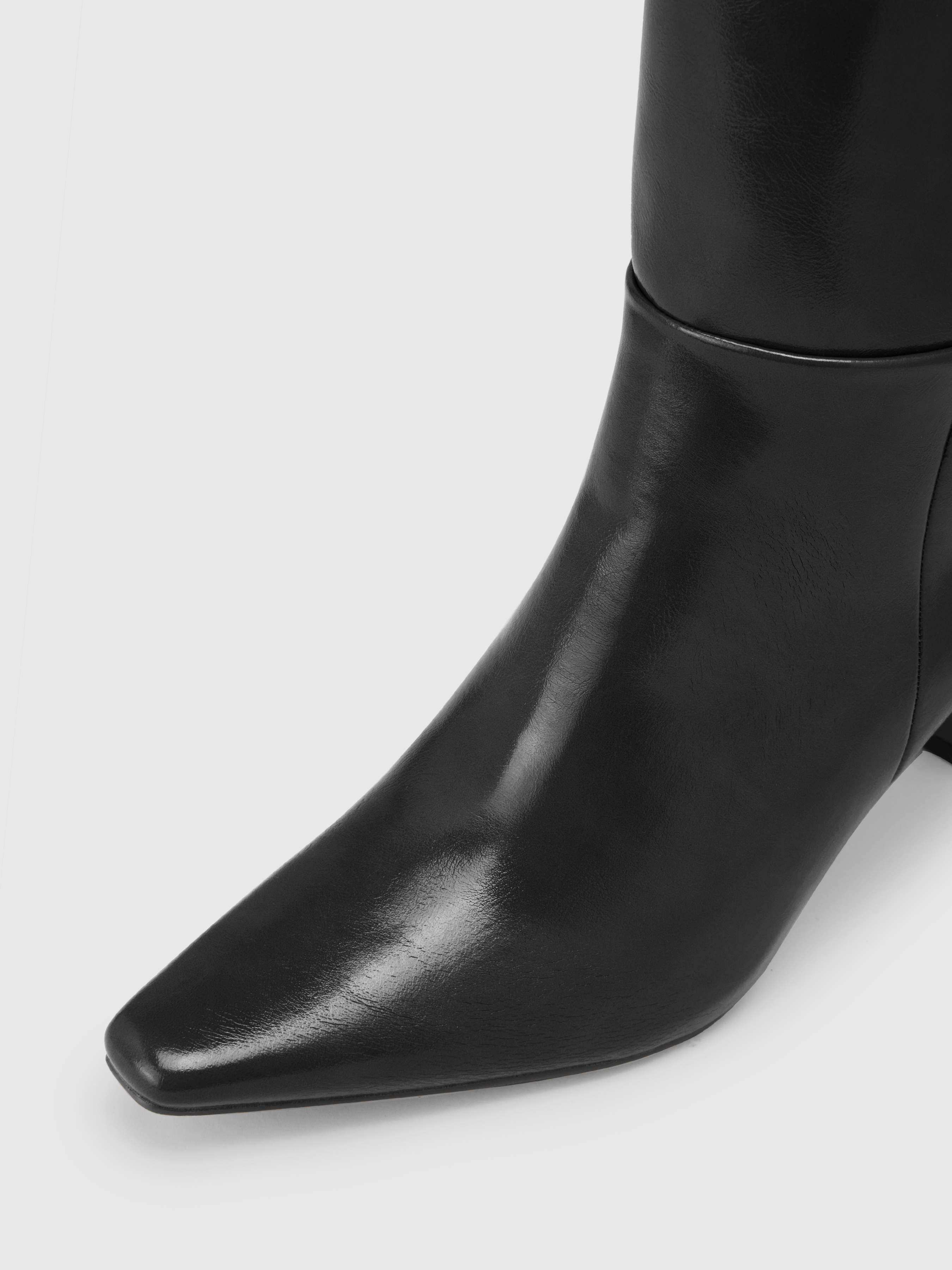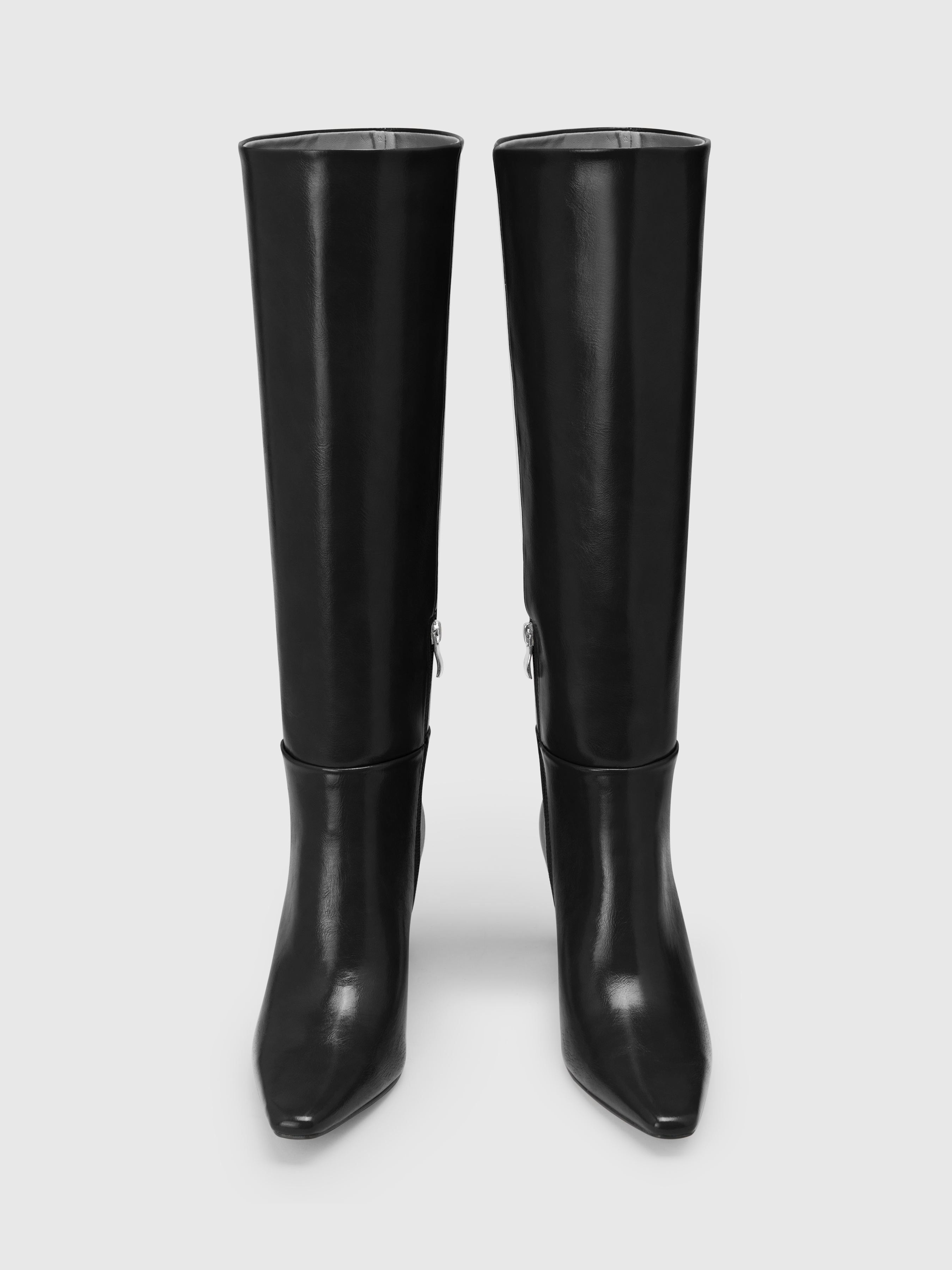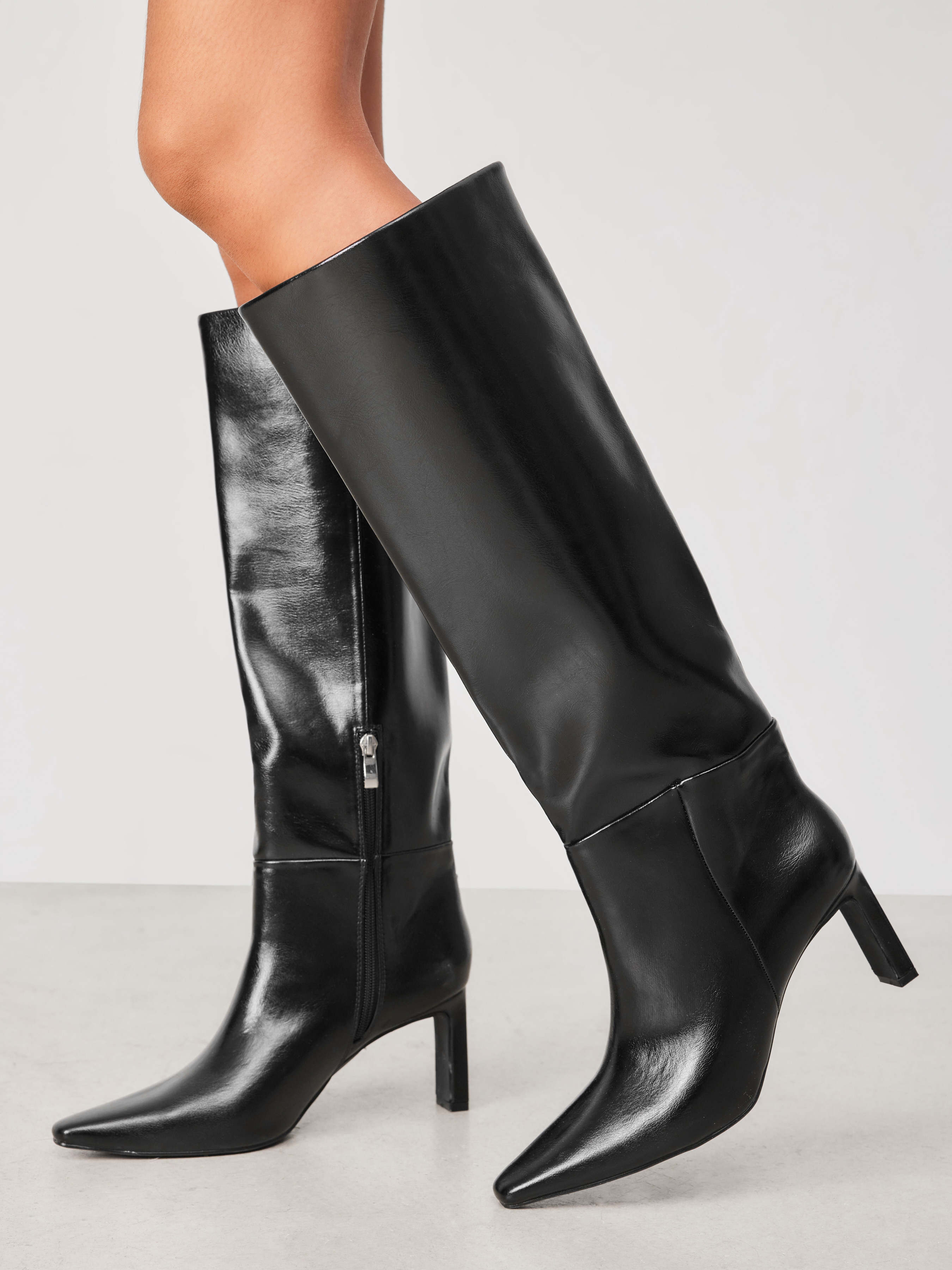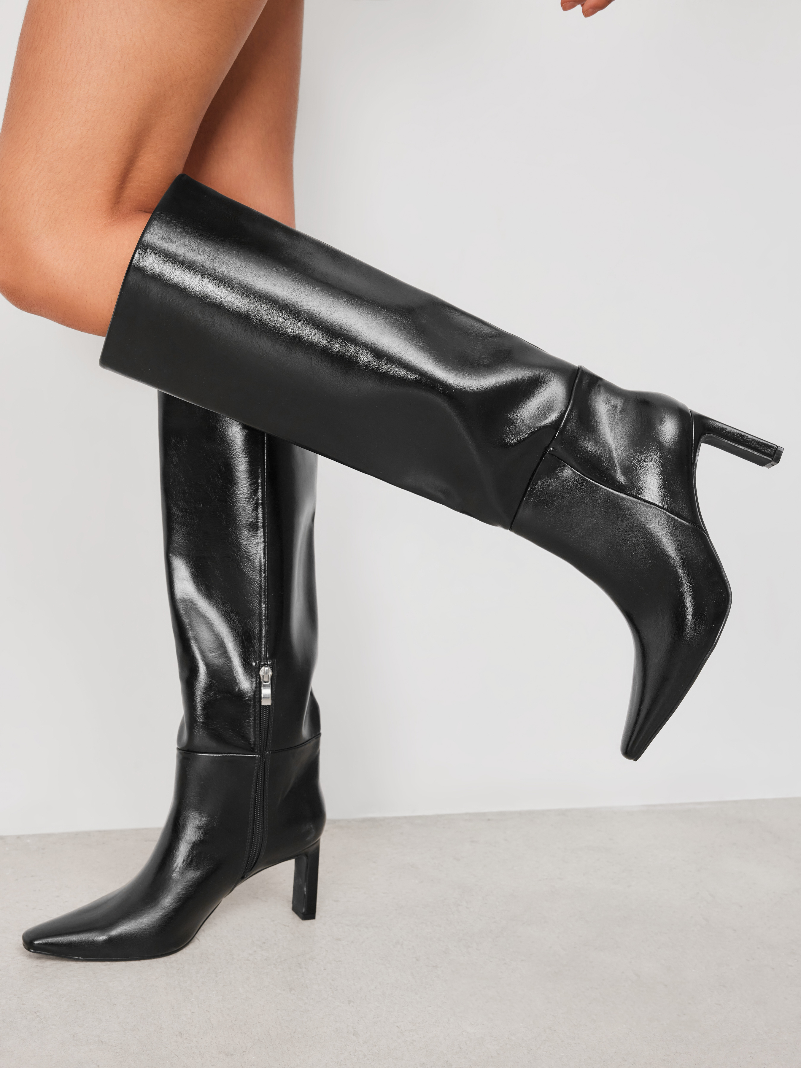 Stiefel bis zur Kniekehle mit spitzen Zehen und massiven Absätzen