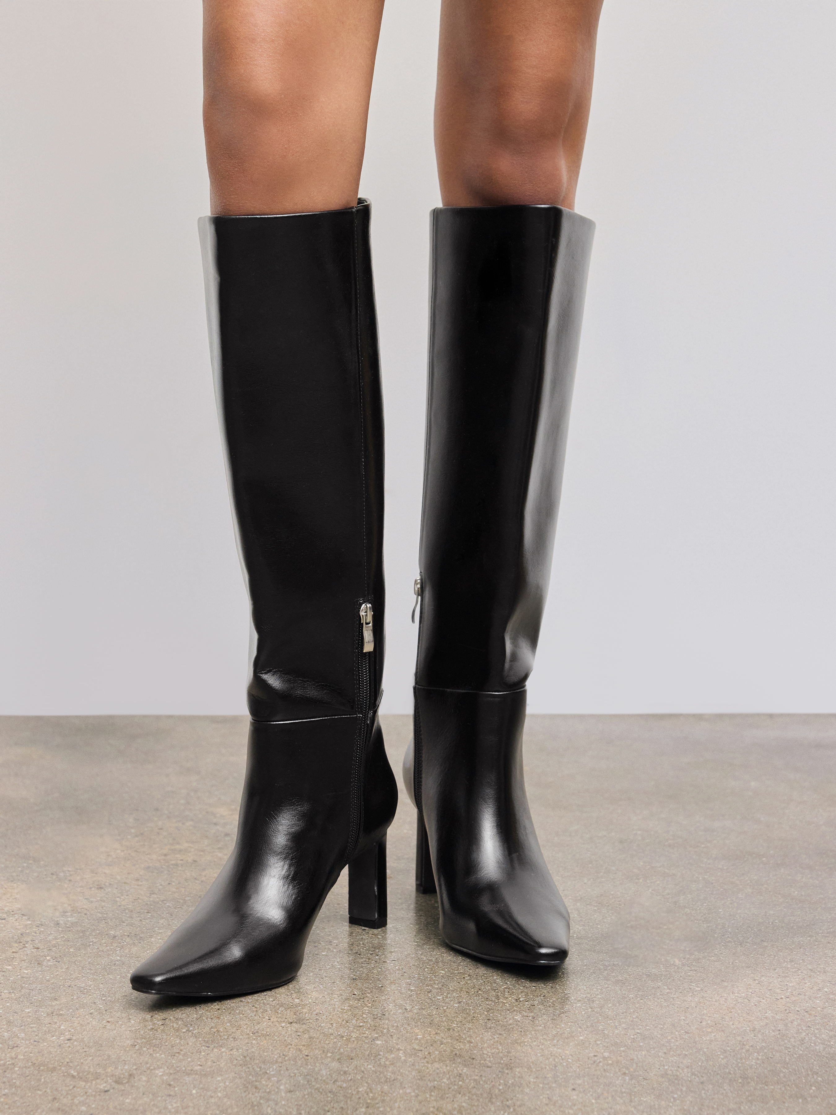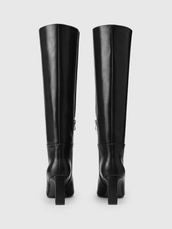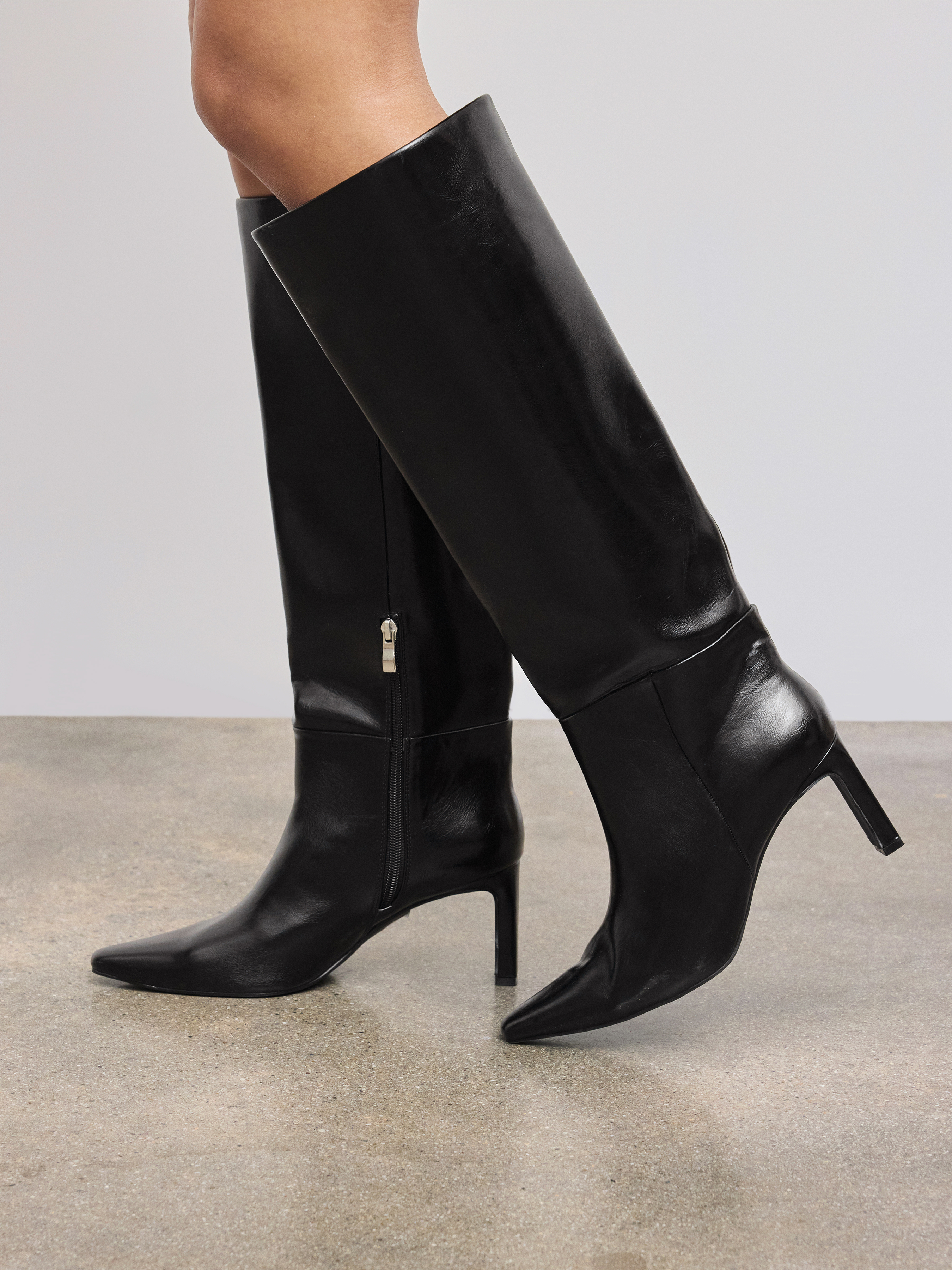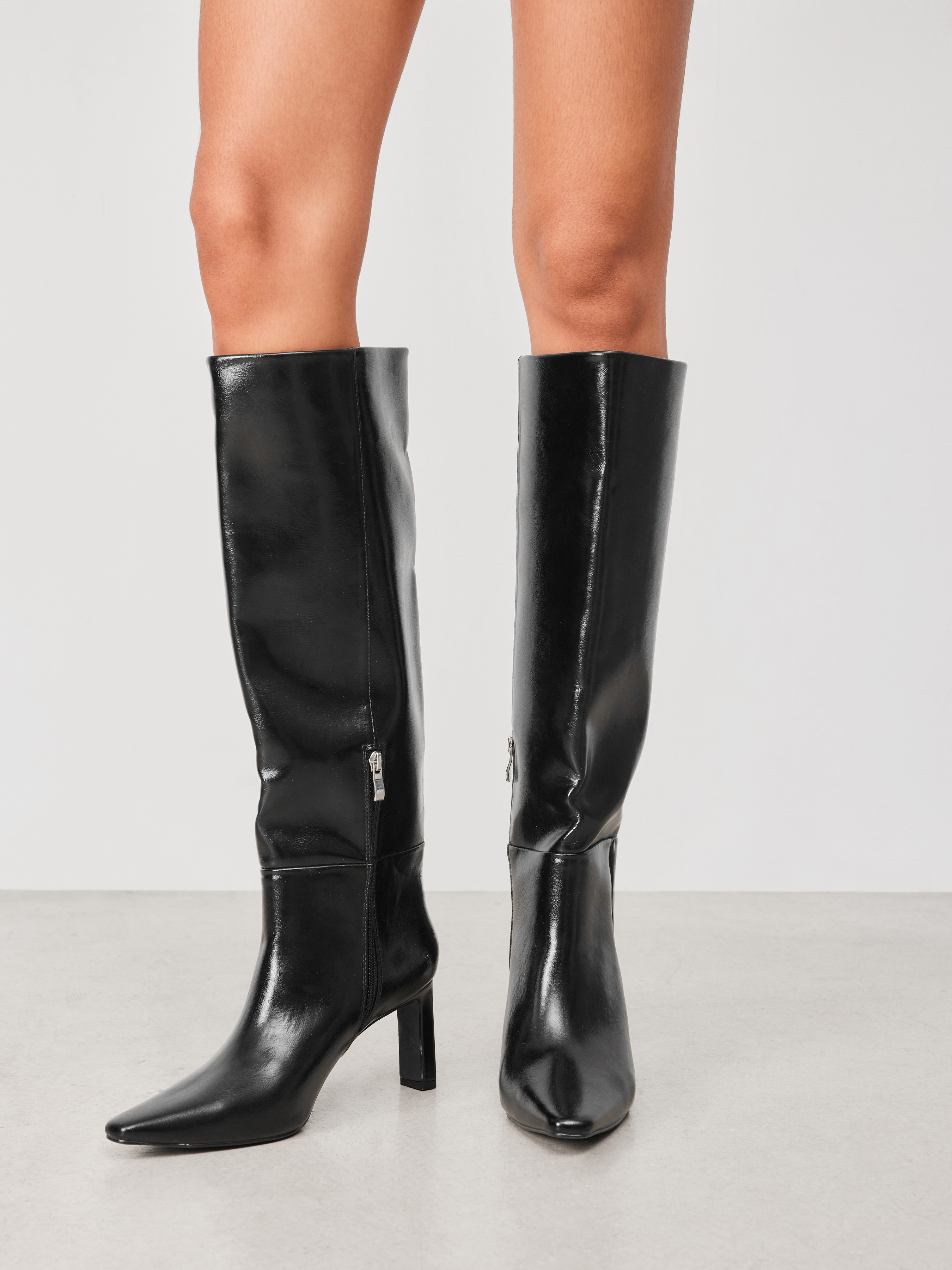 Stiefel bis zur Kniekehle mit spitzen Zehen und massiven Absätzen