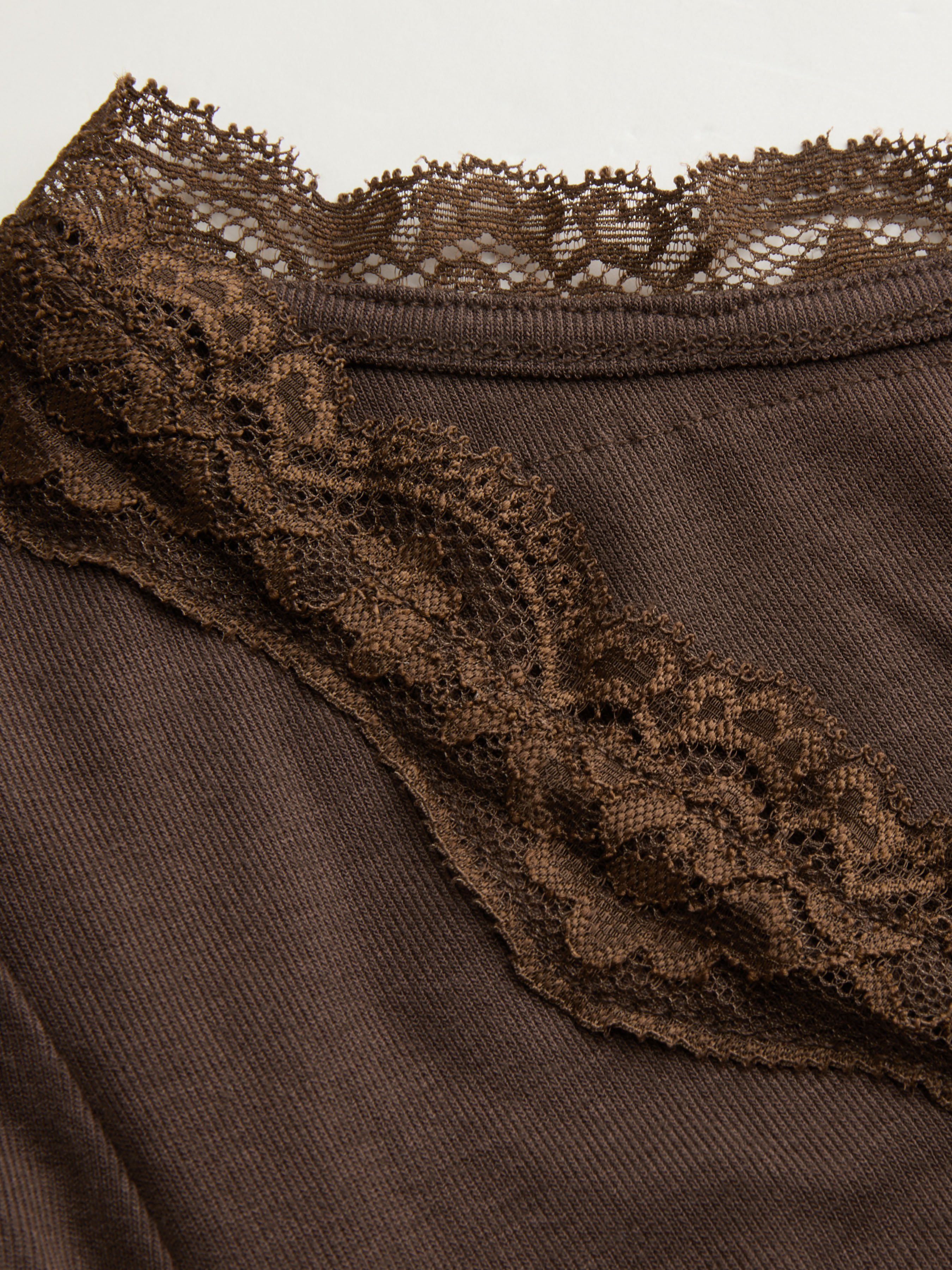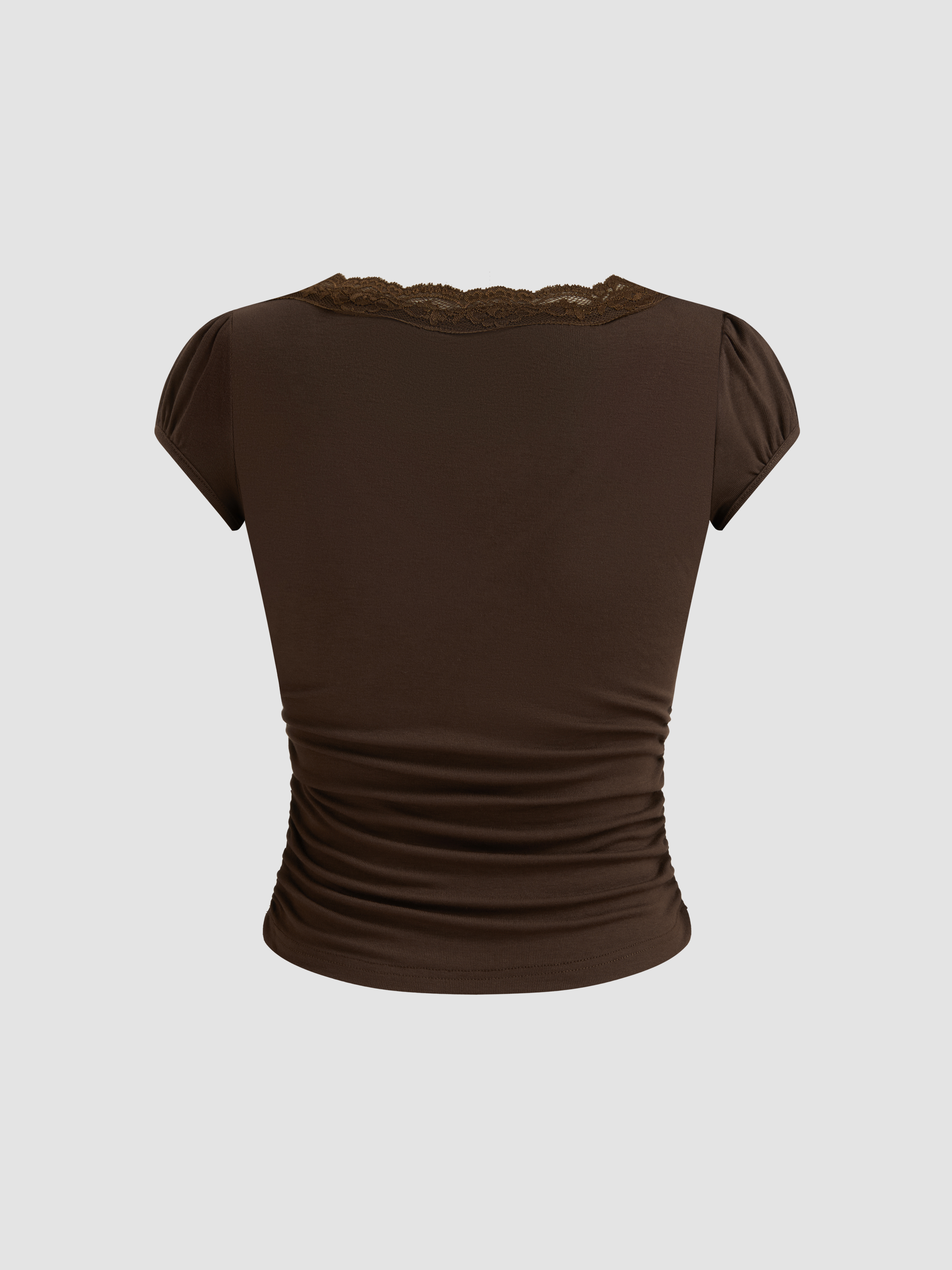 V-Ausschnitt Einfarbig Spitze Ruchedung Kurzarm Tee