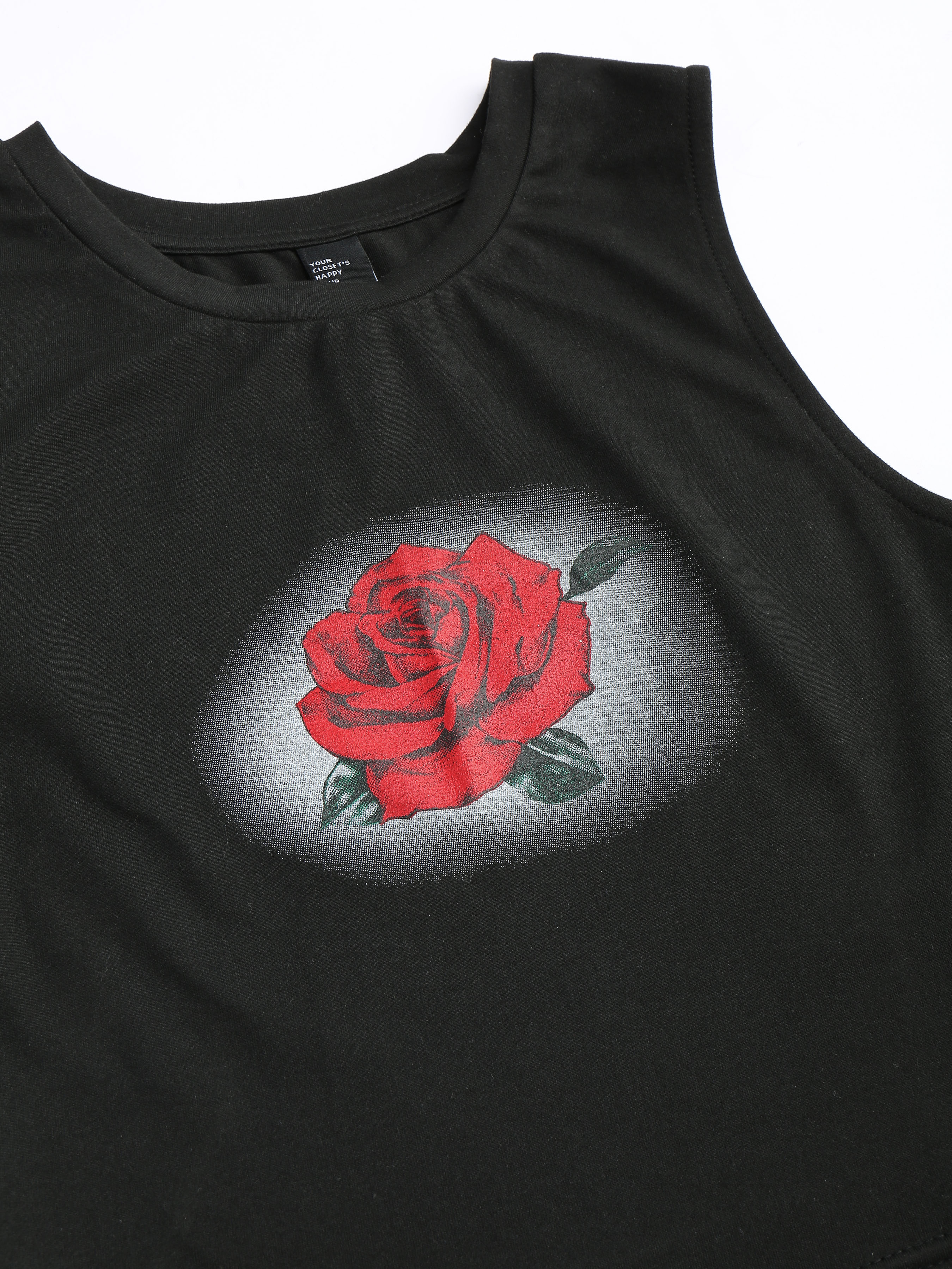 Our Rebel Rose Graphic Cropped Tank Top features a high cut neckline with a cropped fit and sleeveless design. With a printed rose graphic, this black crop top is cool and edgy. Pair with your favorite denim trousers or mini skirt to complete the look.