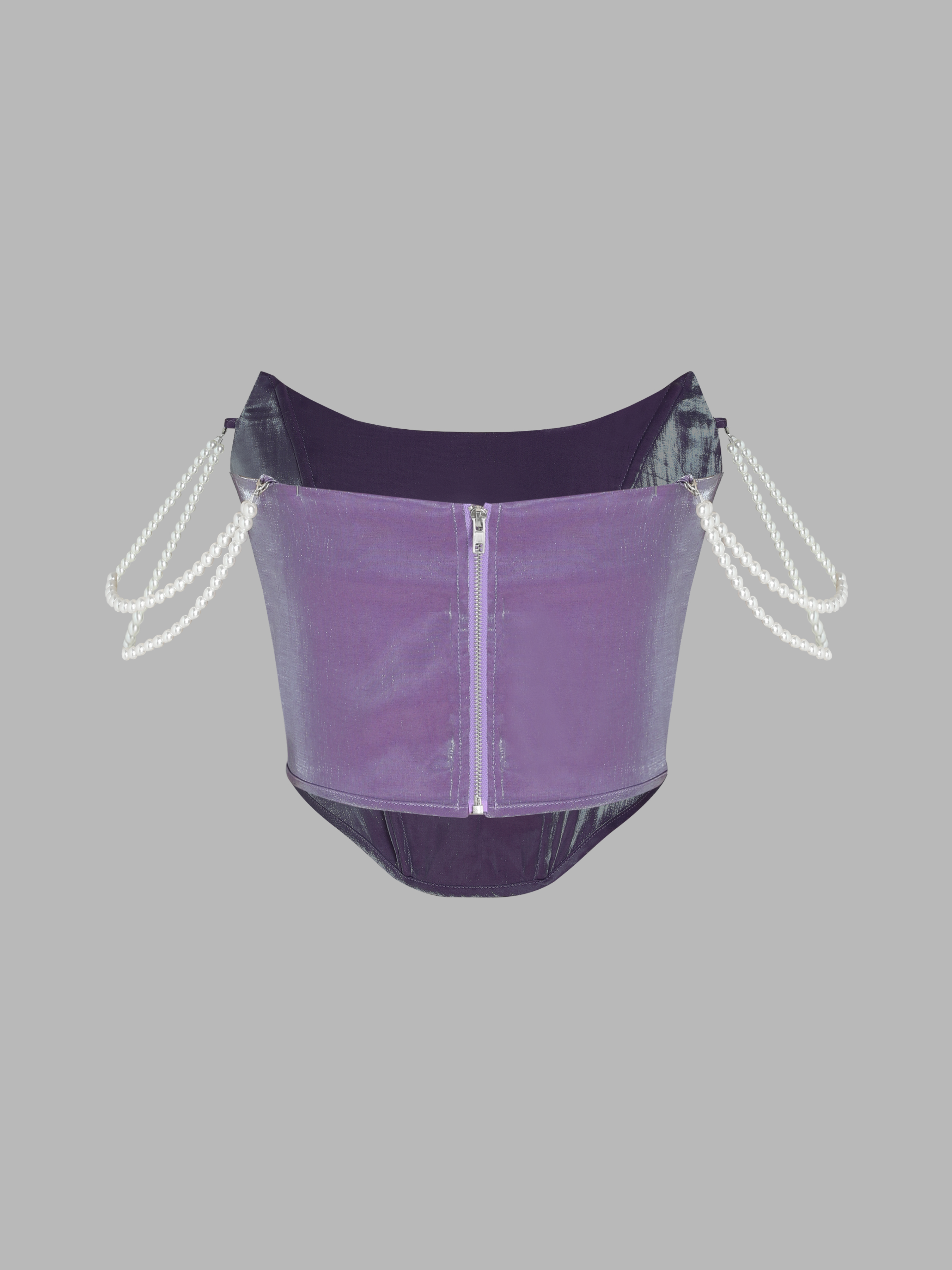 Unser Fliederhimmel Schulterfreies Korsett-Oberteil zeichnet sich durch einen eckigen Ausschnitt mit perlendetailierten, schulterfreien Trägern und einer kurzen Passform aus. Mit einem fliederfarbenen Farbton und einem Korsett-Design ist dieses ärmellose Oberteil ätherisch und verträumt. Kombiniere es mit deinem Lieblings-Minirock oder fließenden Hosen, um den Look zu vervollständigen.