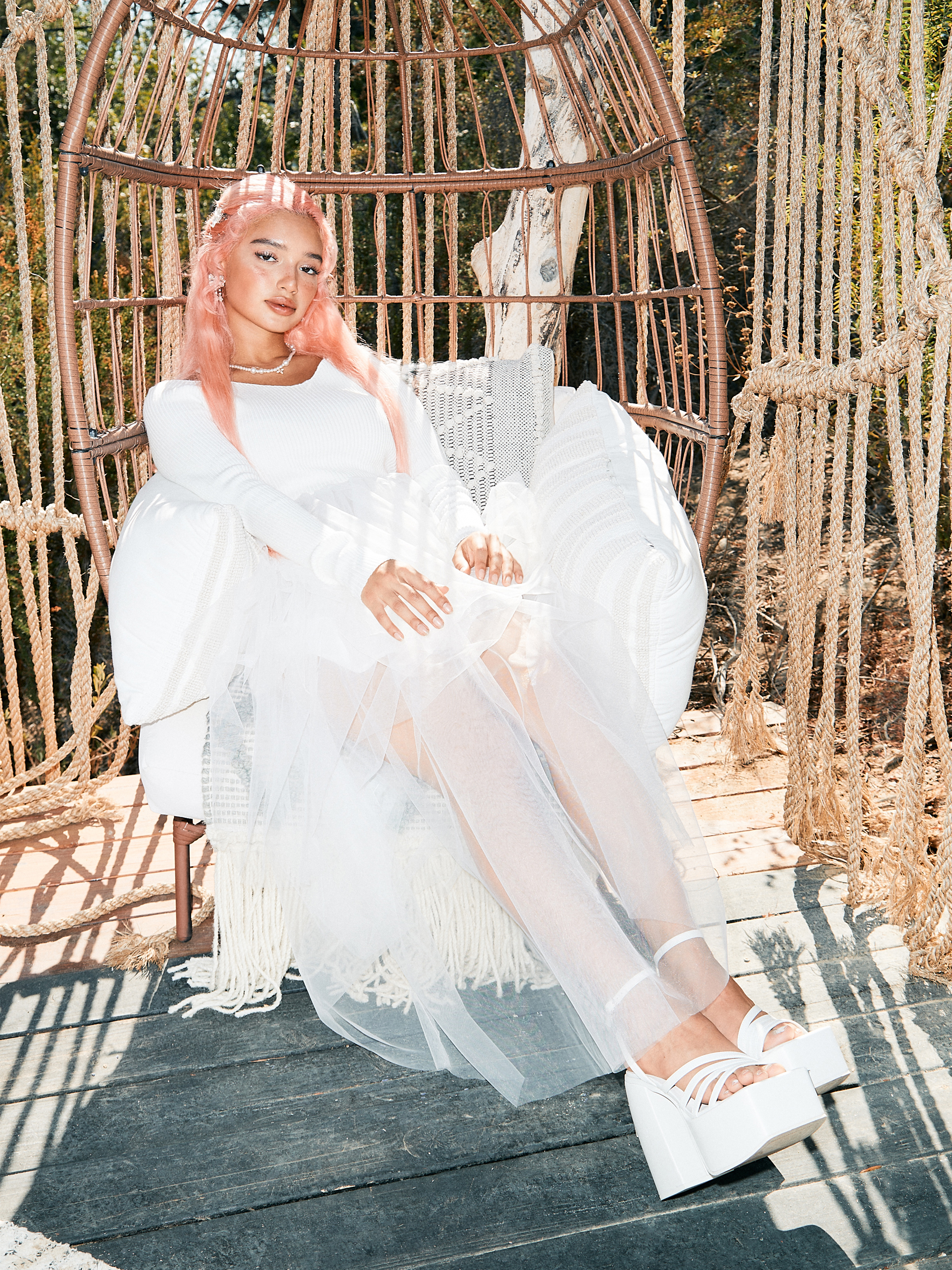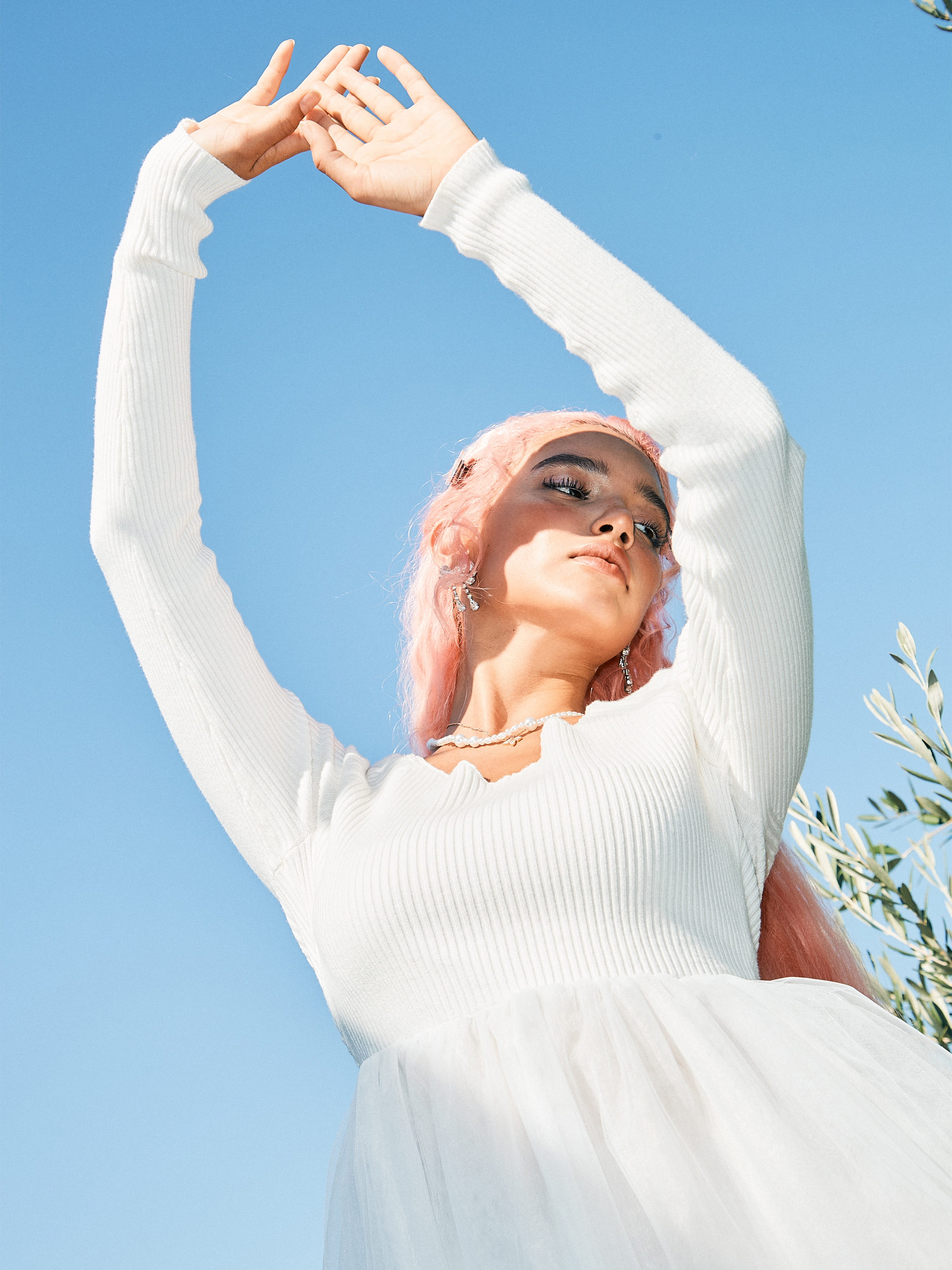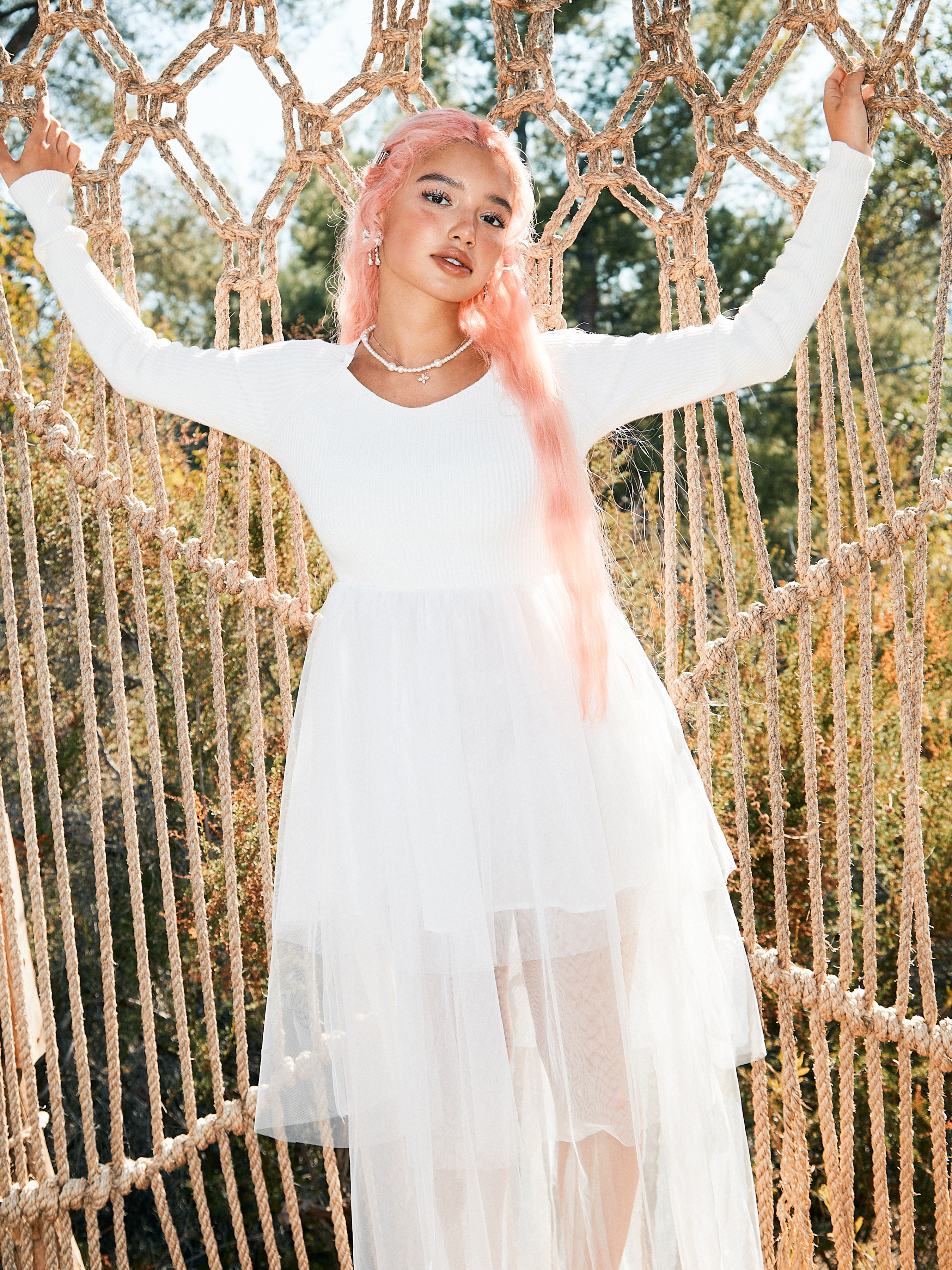 Unser Weißes Flüstern Strick-Midikleid besticht durch ein weiches, gestricktes Material mit einem fließenden Rockdesign und eng anliegenden langen Ärmeln. Perfekt zum Aufpeppen oder Herunterstufen, dieses langärmlige Midikleid ist verträumt und süß. Kombiniere es mit deinen Lieblingssneakern oder Plateausandalen, um den Look abzurunden.